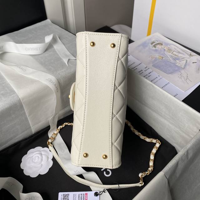 Chane1 24A 高级手工坊系列 As4957 包包设计颗粒小牛皮与金属 表现出现代与经典的完美平衡 它具有拱形手柄和链条肩带的组合,使其既可以手提,又可以斜挎。包身上通常搭配小香标志性的双c标志和翻盖式设计,简洁而精致。