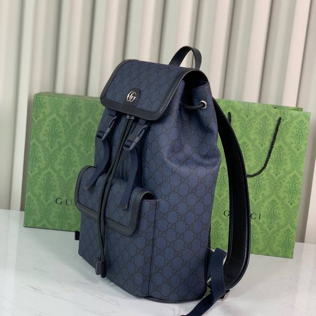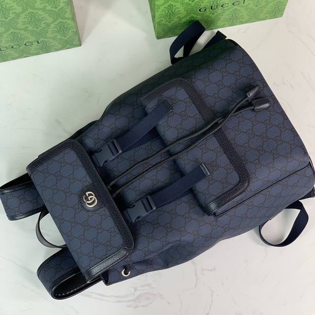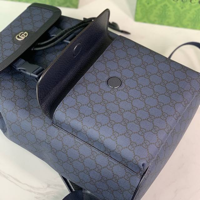 Ophidia系列gg背包,蓝色和黑色gg搭配黑色皮革滚边,银色调配件,棉麻里衬,内部:一个拉链袋,外部:一个磁扣前袋,抽绳和翻盖开合,款号792114宝蓝,尺寸29X40.5X13.5~
