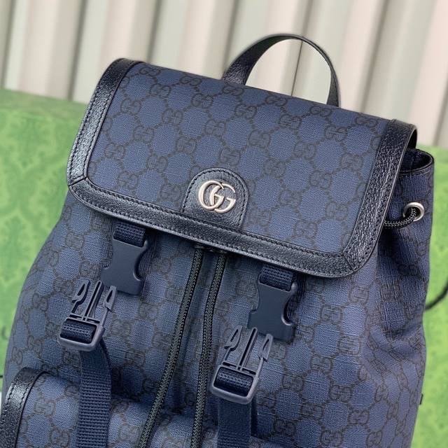 原厂皮 Ophidia系列gg背包,蓝色和黑色gg搭配黑色皮革滚边,银色调配件,棉麻里衬,内部:一个拉链袋,外部:一个磁扣前袋,抽绳和翻盖开合,款号792114
