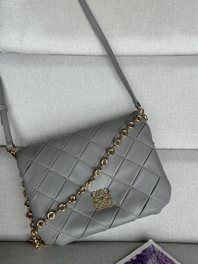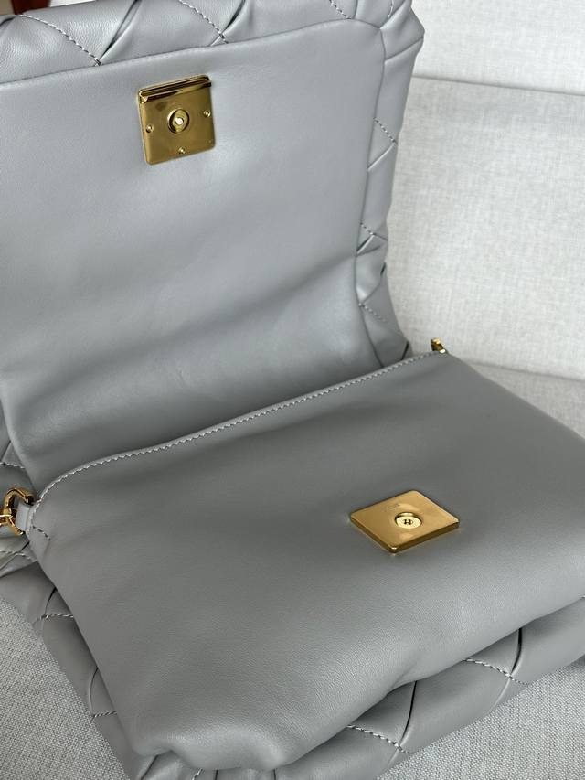 Puffer Goya 受到了 Goya 美学的启发,通过带有鹅毛衬垫的闪亮纳帕羊皮革,带来了全新的感官和触觉维度。 配有可拆卸且可调节的金属甜甜圈链条和一条可拆卸皮革带子。 这个版本采用褶皱羊皮革,经过裁剪、缝制和手工编织制成。