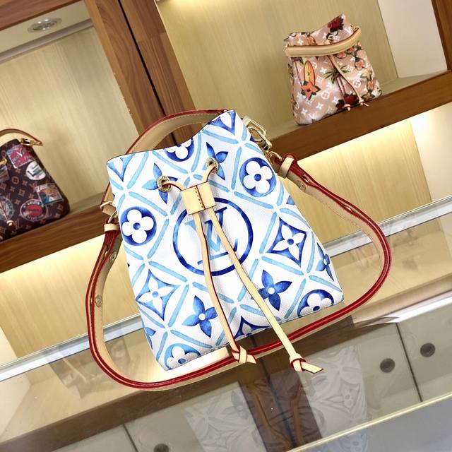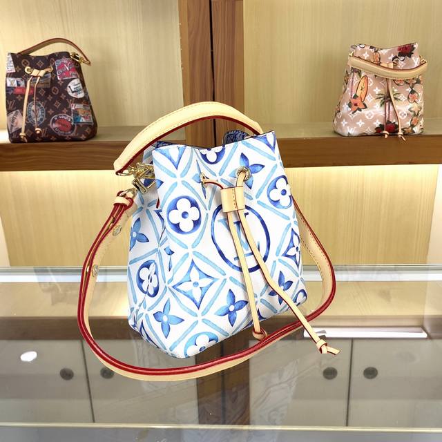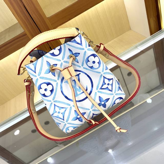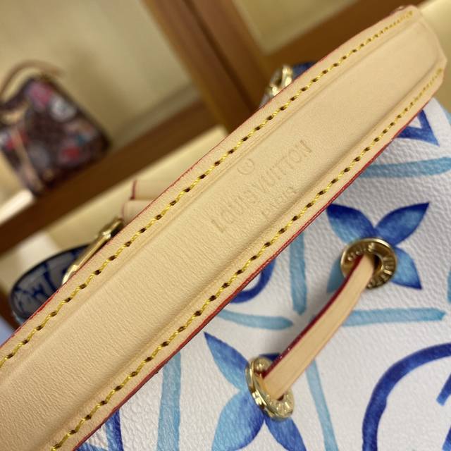 本款 Neonoé 水桶包为淡雅帆布描绘 Giant Monogram 印花,令 Lv 和 Monogram 花卉呈现深浅不一的水彩效果,搭配抽绳和中央按扣内袋,流露闲适假日气息。