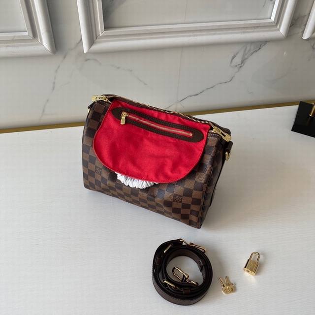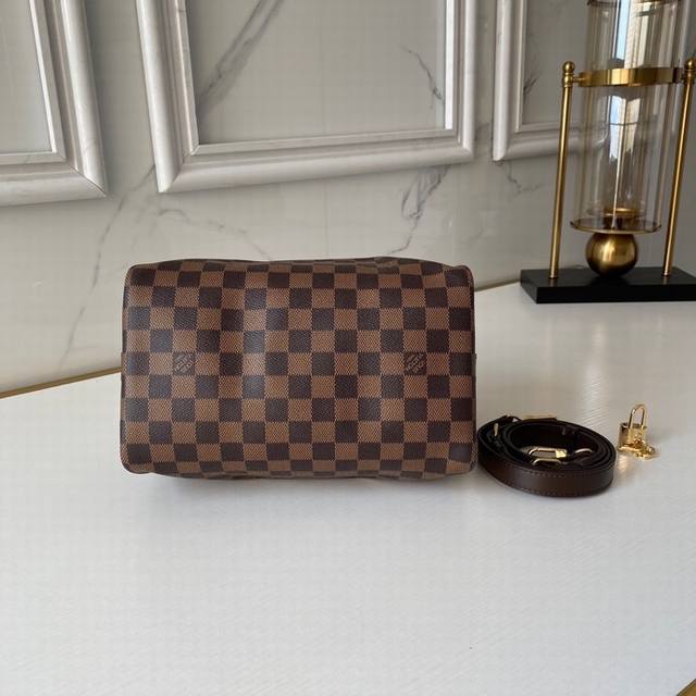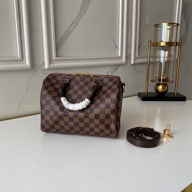 复刻版 N41368 啡格枕头包 这款speedy 25 最初在 1930 年是为旅行者而设计,配有斜背用包带,内袋有拉链,进口台湾面料 进口牛皮尺寸:长25 X 高19 X 宽15 Cm 4453088