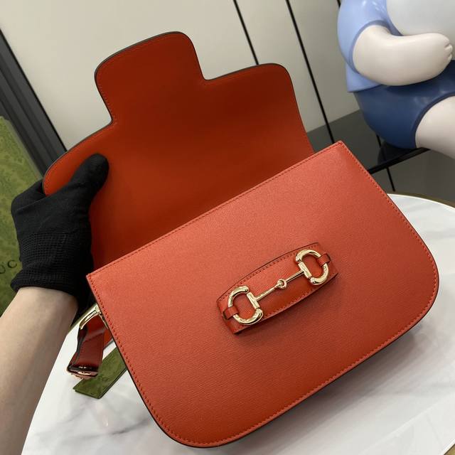 配全套原厂绿盒包装 新品 Gucci Horsebit 1955系列肩背包。Gucci Horsebit 1955系列肩背包在2020早春系列中惊艳亮相,以新颖视角演绎经典设计。这一手袋延用了六十余年前经典单品的线条与造型,将经典细节与现代精神巧妙融合,强调了马衔扣这一品牌标志性设计元素。灵感源自马术世界的双环和连接条两个元素构成的这一设计图案已经成为品牌耀眼的标志性元素之一。在这款小号翻盖肩背包上,这一配件与织纹橙色皮革材质相映成趣,同时配以可调节肩带,可在肩背和斜跨之间自由转换。拥有多种穿搭方式和风格