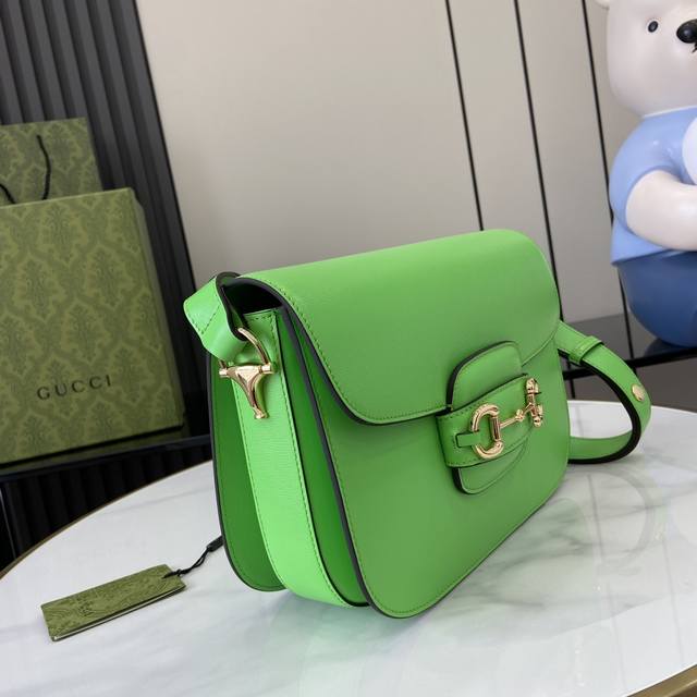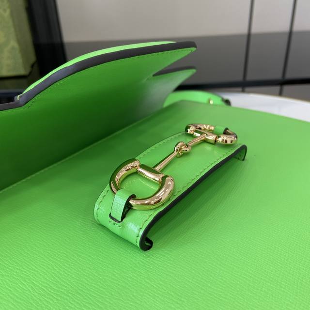 配全套原厂绿盒包装 新品 Gucci Horsebit 1955系列肩背包。Gucci Horsebit 1955系列肩背包在2020早春系列中惊艳亮相,以新颖视角演绎经典设计。这一手袋延用了六十余年前经典单品的线条与造型,将经典细节与现代精神巧妙融合,强调了马衔扣这一品牌标志性设计元素。灵感源自马术世界的双环和连接条两个元素构成的这一设计图案已经成为品牌耀眼的标志性元素之一。在这款小号翻盖肩背包上,这一配件与织纹绿色皮革材质相映成趣,同时配以可调节肩带,可在肩背和斜跨之间自由转换。拥有多种穿搭方式和风格