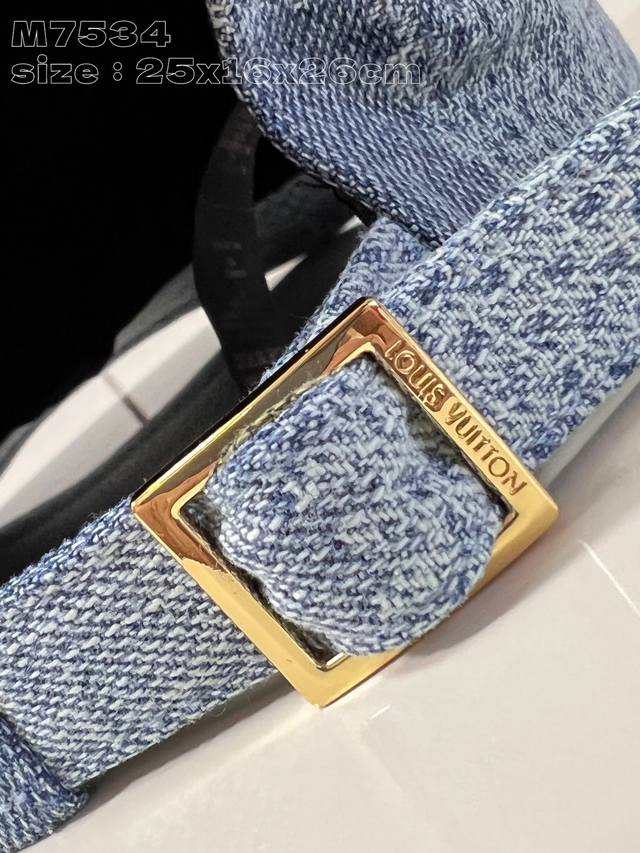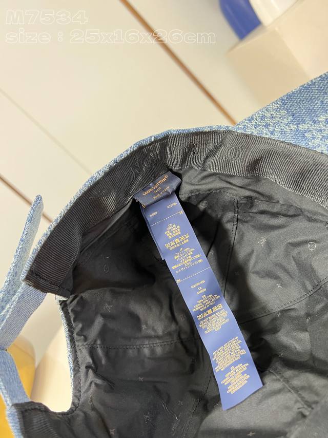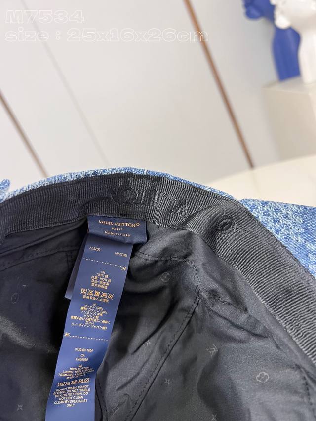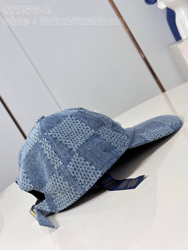 出厂价 顶级原单 M7534 Damier Denim 3D 棒球帽取材丹宁布,以清新笔触描绘 Pharrell Williams 于 2024 春夏秀场焕新演绎的标志性格纹,再选用粗绳刺绣帽檐上方的醒目 Lv 标识。25 X 16 X 26厘米 长度 X 高 X 宽