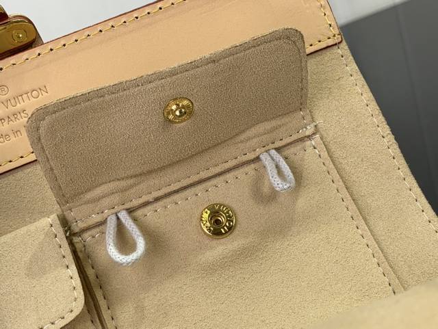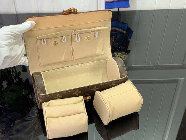 做工精良,由 Monogram 帆布与皮革饰边拼合而成。小巧尺寸内含充裕空间。内部安全口袋采用按扣开合设计。座枕其一设有插槽,可存放项链、腕表、戒指、手镯及耳环。耀目 S-Lock 锁扣增添精致柔美韵味。