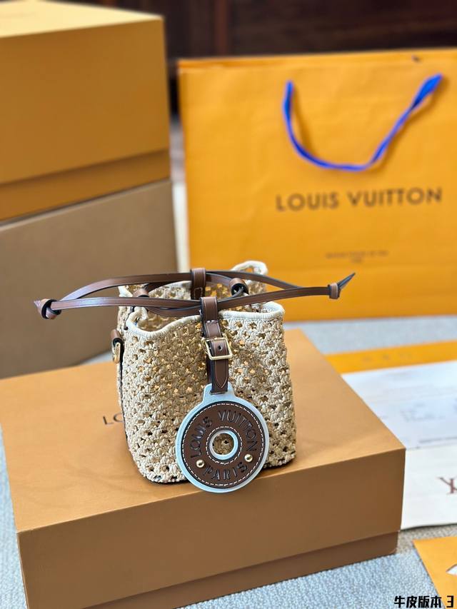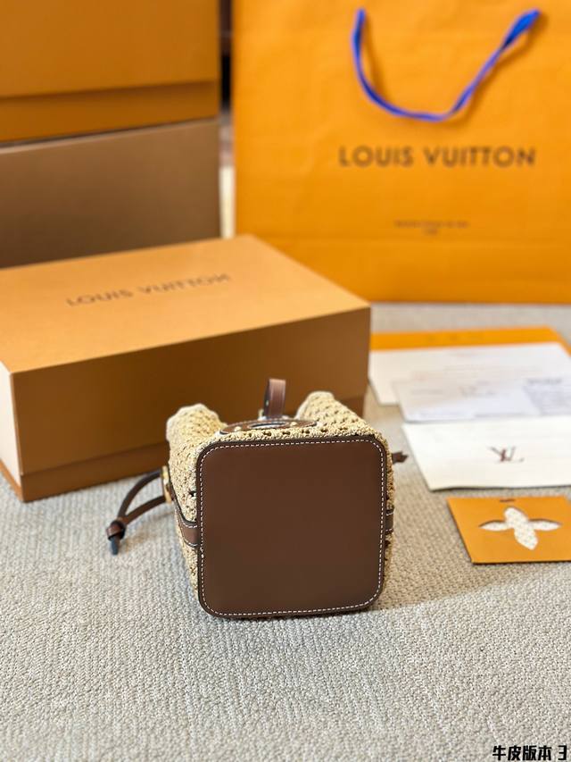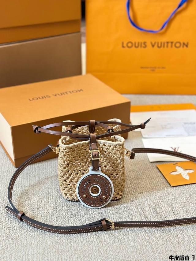 本款 Noe Purse 手袋为钩编拉菲草搭配皮革饰边,以源自noe 手袋的抽绳设计收束精巧构型。肩带和路易威登