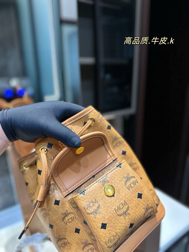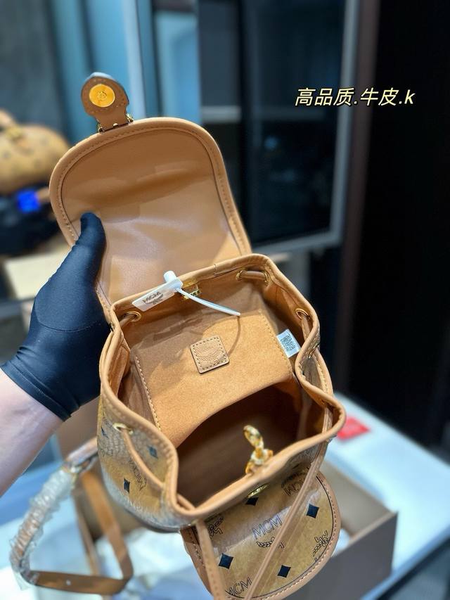 / Mcm新品复古抽绳双肩包 集休闲复古为一体的抽绳设计 整体质感轻柔自重很轻 容量可以放下日常物品 包括折叠伞保温杯 双肩+抽绳我只能说是解放双手的百搭单品我是搭