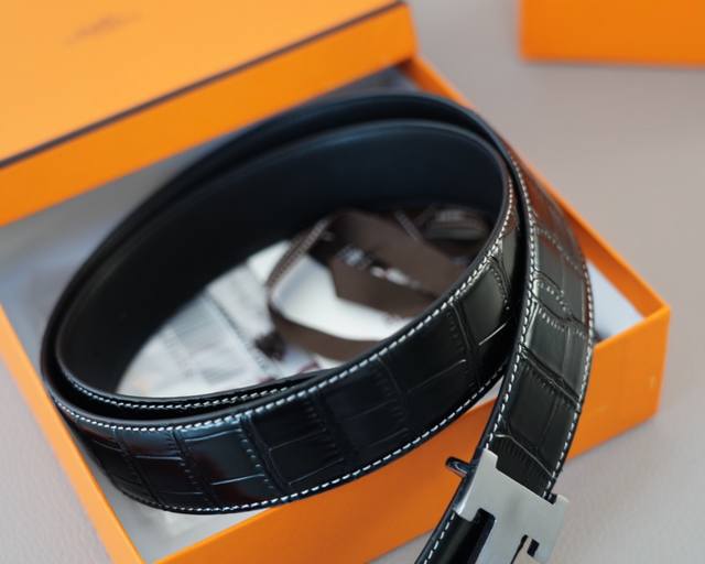 p410 爱马H家 水染雾面A级奢华高贵上档次鳄鱼骨皮 出货搭配精美手工钢扣-[闪电][玫瑰]宽度:3.8Cm长度105-125Cm