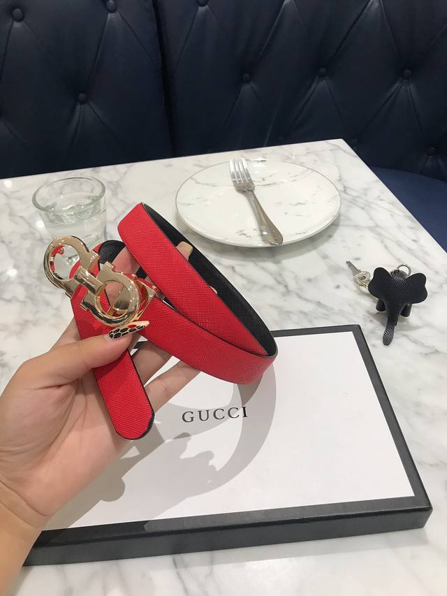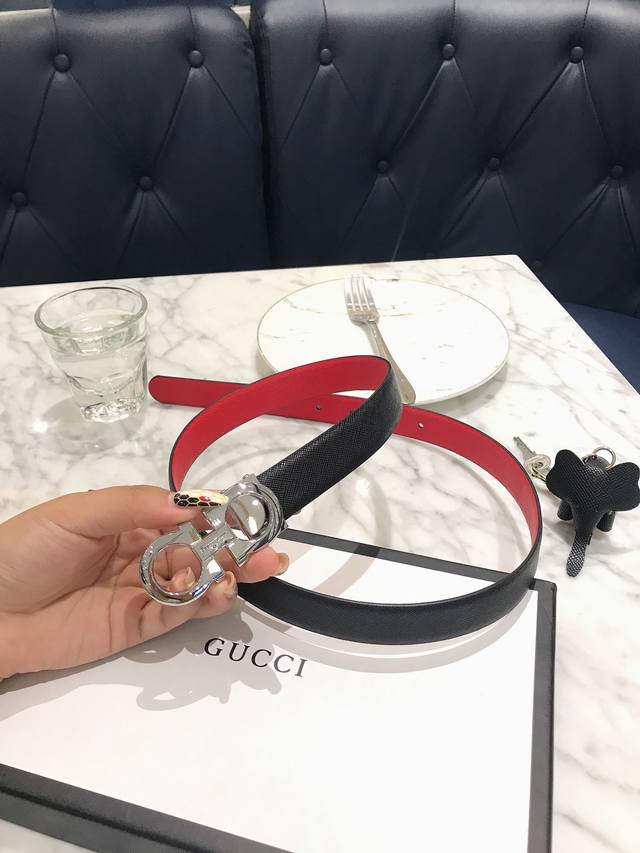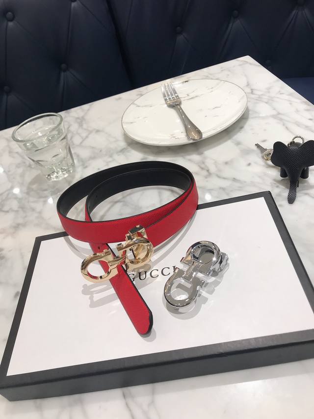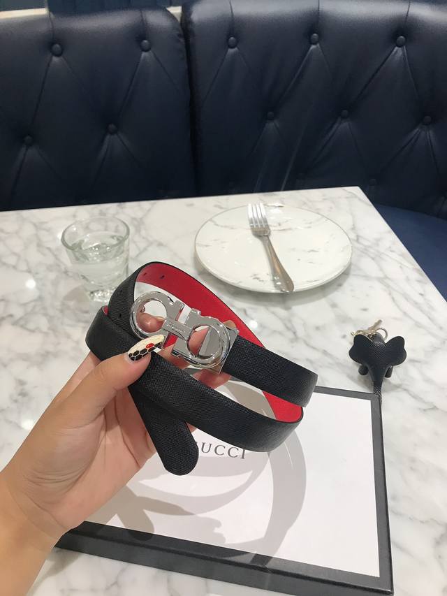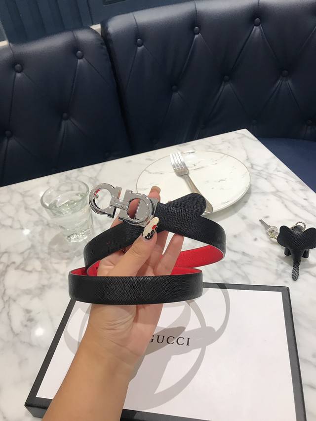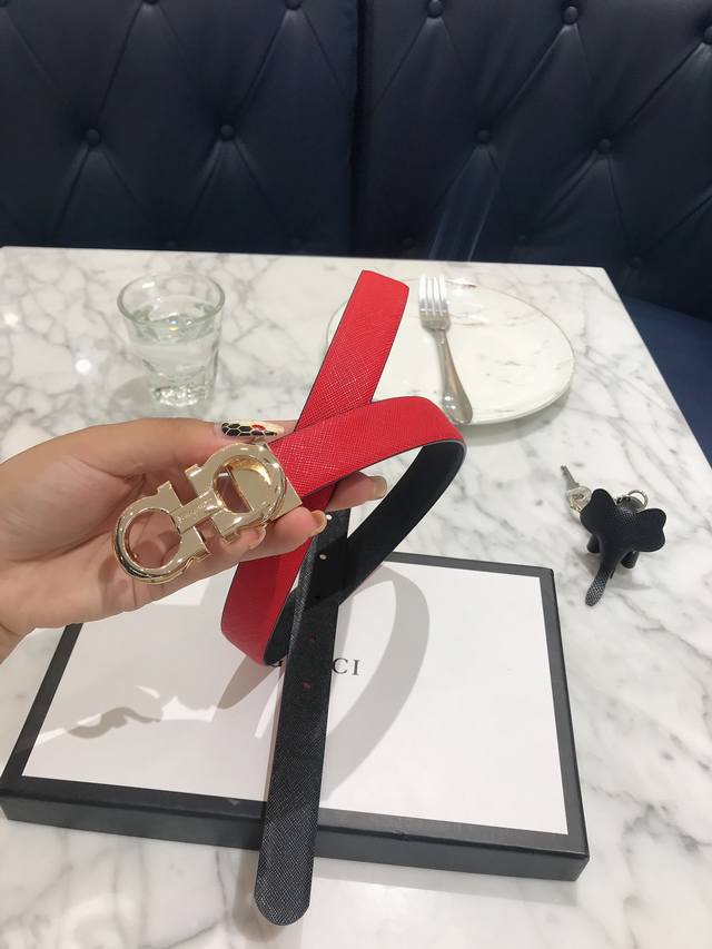 菲拉格慕 原版带身.双色为一体.双面可用。一面黑色 一面红色搭配菲拉格慕新款精品扣。原产皮料定制,时尚男女必备专柜宽度2.5Cm. 温馨提示:长度100-125Cm 长度也可自行裁剪,工艺精湛,F家经典之作.