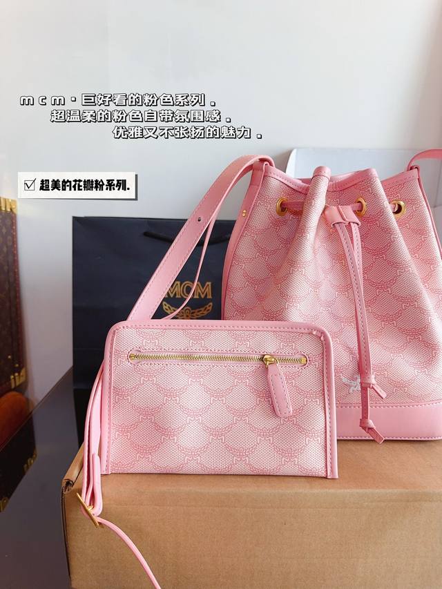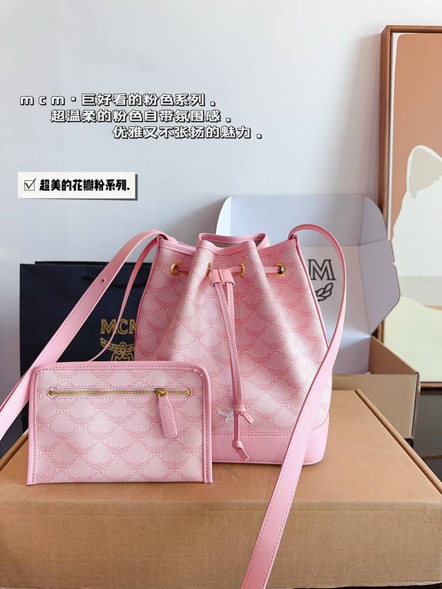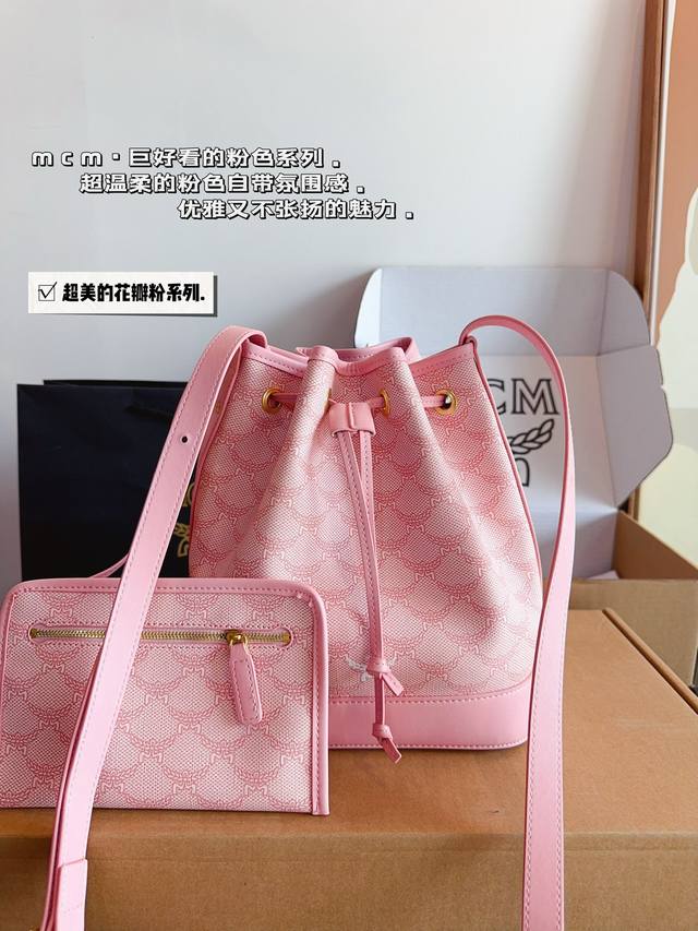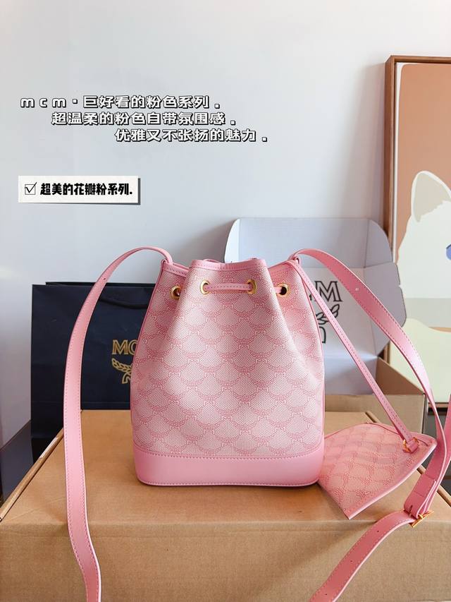 配礼盒 Mcm 抽口水桶包新品 内容超大 物超所值。超千皮系列单肩 斜挎包原单货 高品质 特别实用的一款原版五金logo 对版内里 尺寸:23*12*27Cm