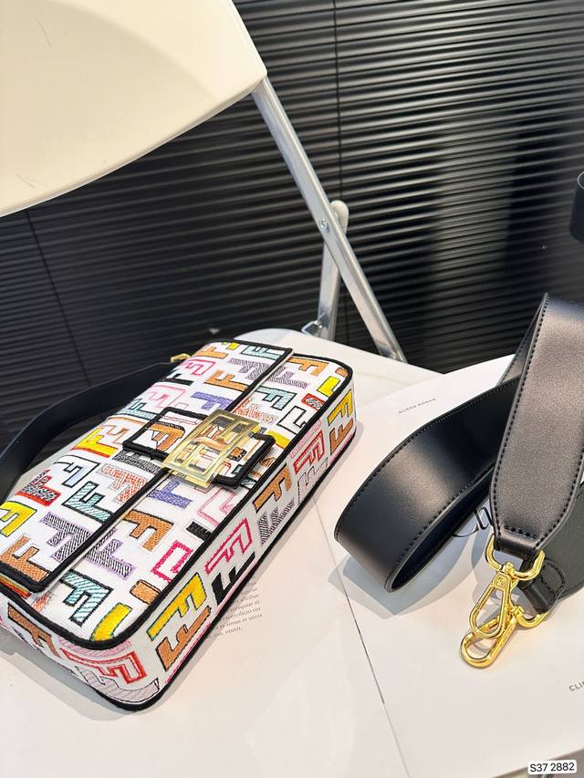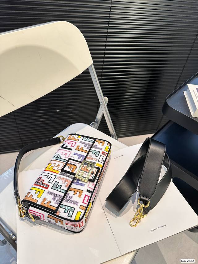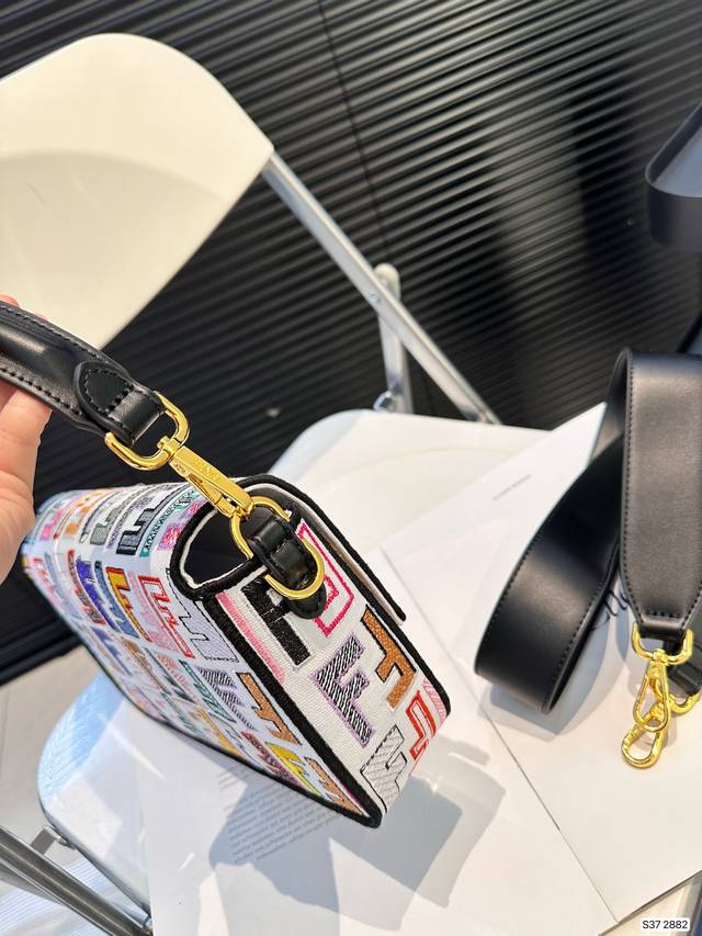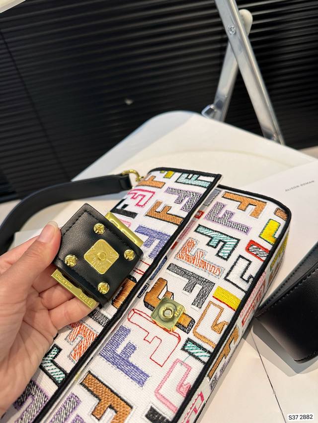 Fendi Baguette芬迪刺绣法棍包中号第一眼就觉得砸中了我。加上中号有一根较长的肩带,非常实用。装两个手机,钱包,钥匙,墨镜,口红,粉饼都毫无压力。看起来虽然不算太大但是绝对很能装。尺寸27 15 货号2882
