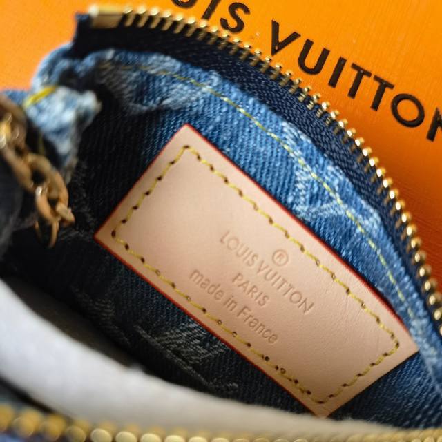 颜色 蓝尺寸 12X7X1.5牛仔布“Pochette Cle 卡片钥匙包”采用石洗交织字母牛仔布制成,搭配鞣制皮革饰边和金色金属配件。它不仅可以用作钥匙扣,而且安全的拉链式开口还可以容纳现金和卡片。它还可以用小钩子和链条固定在包或腰带上