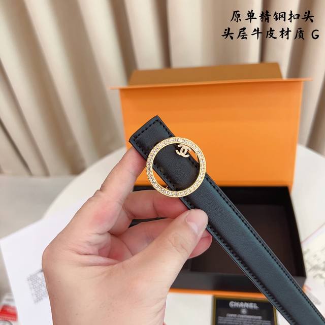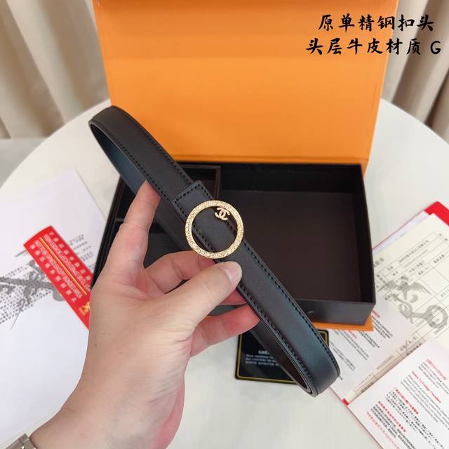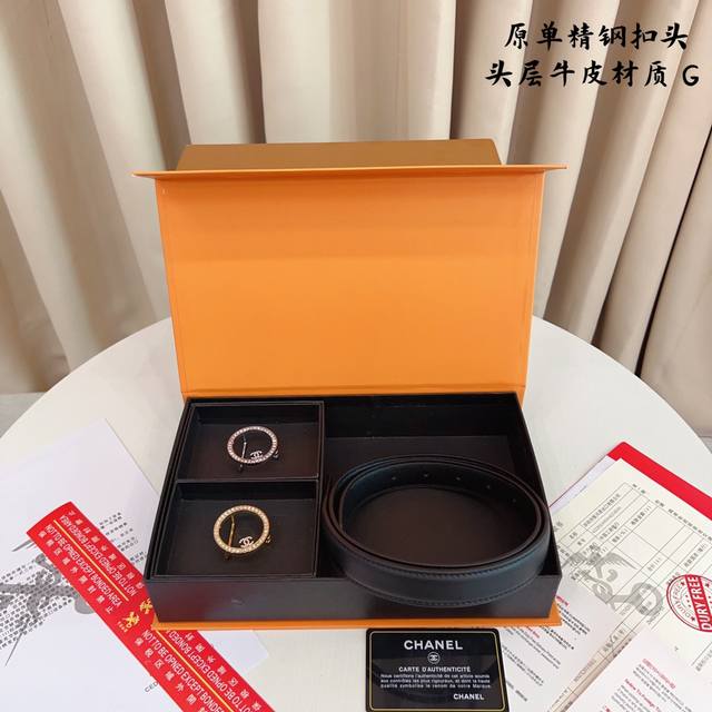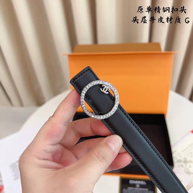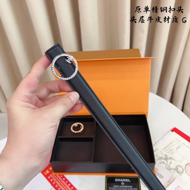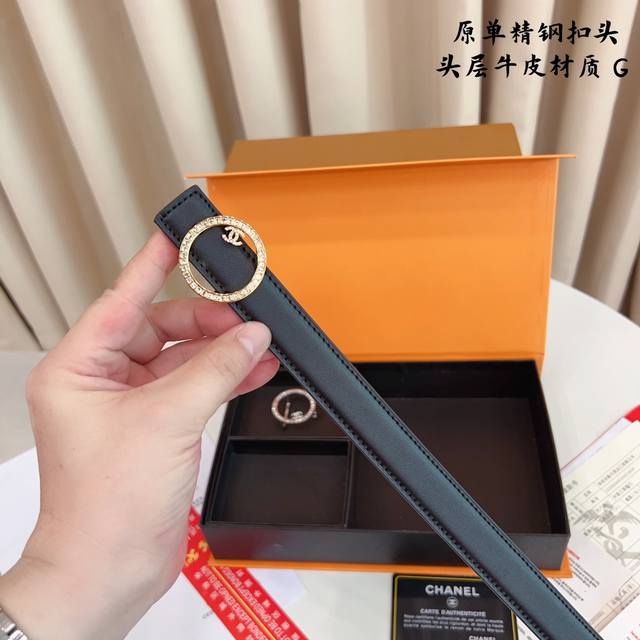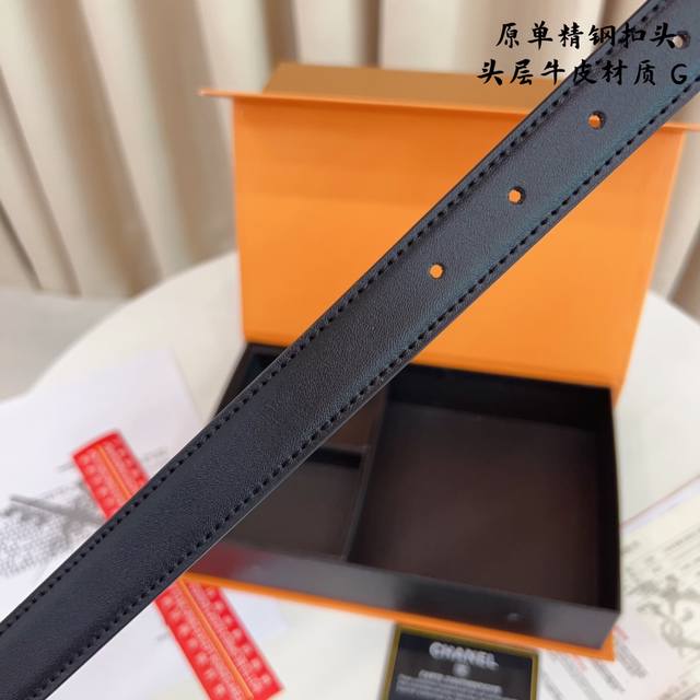 原单钢扣版香奈c家 打孔 正版开模 此款腰带双面采用原厂牛皮带身,精密电镀标志性纯钢搭扣 对版专柜。2.5Cm 如需木盒40