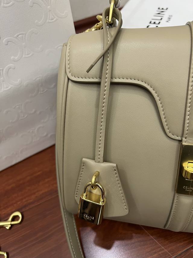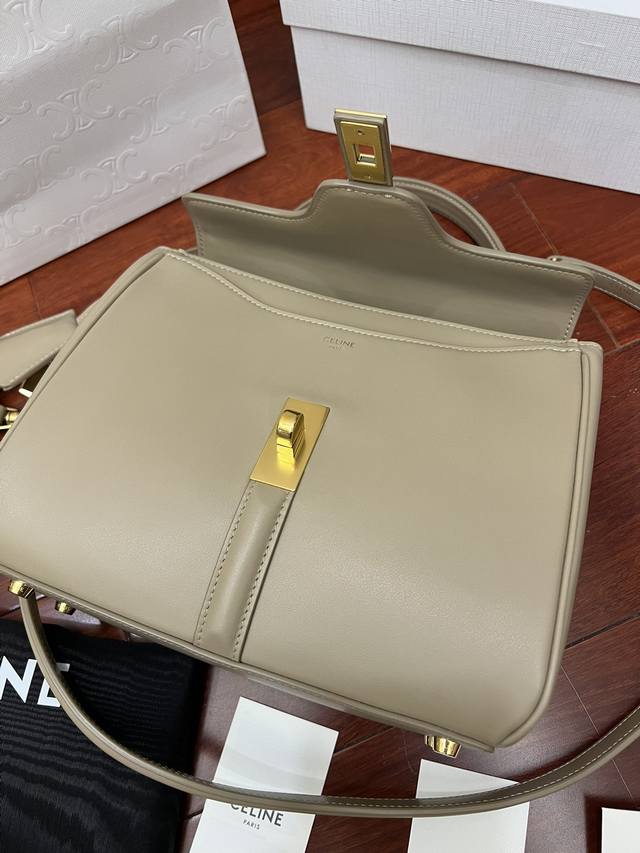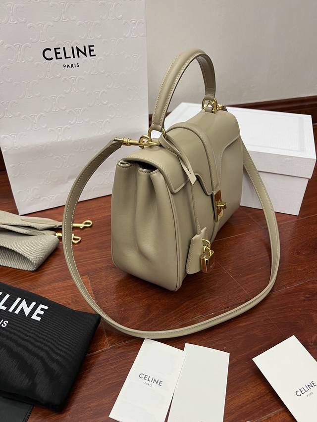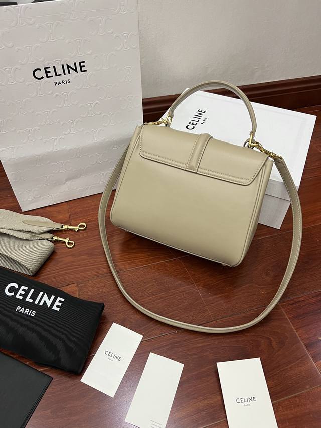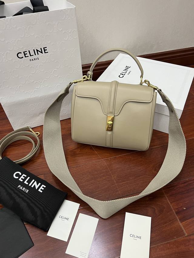 Cel-Ine新经典strap“16”手袋 Hedi 就任当天设计首作 得名于ce家坐落于巴黎2区薇薇安街16号 16 Rue Vivienne 充分演绎了巴黎风尚。“16”手袋撷取品牌历史上数款经典手袋设计元素,如极具六零年代风格的裁边形翻盖,圆润包身曲线及扣带装饰。塑造celine新经典:小号:23-19-10.5外里牛皮 衬里羊皮 包盖旋转锁扣 内侧中央拉链袋扁平口袋 2个内侧隔层 正面翻盖下外置扁平口袋牛皮肩带备用帆布肩带 可拆卸 牛皮肩带长 46Cm 可自搭 帆布肩带长 105Cm