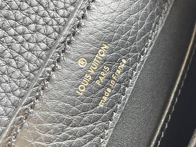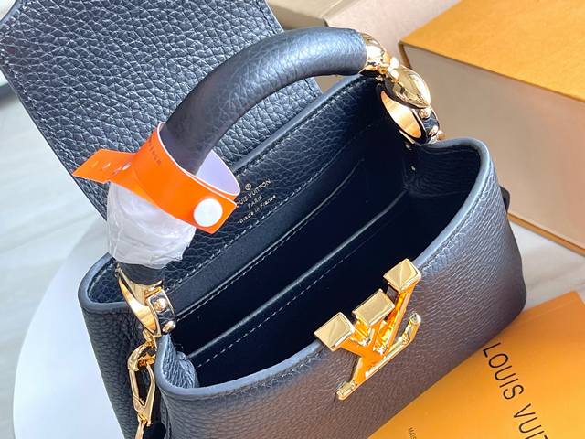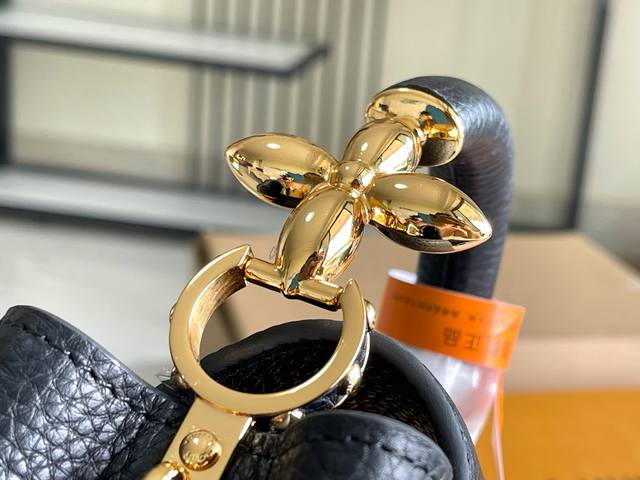 本款 Capucines Bb 手袋以全粒面牛皮革塑造 Capucines 系列的小巧尺寸,搭配 Lv 字母、标志性侧环和 Monogram 花卉翻盖。