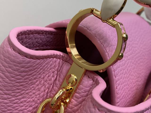 出厂价 顶级原单 M23943粉色 全皮cap那英款系列 本款capucines Bb 手袋 于手柄融入精致monogram花卉,以细腻笔触呈现lv标识的立体观感,为柔美设计注入夺目光彩。全粒面taurillon皮革塑造玲珑构型,可容纳智能手机、短款钱夹和其他随行小物。尺寸:27 × 18 × 9 Cm。