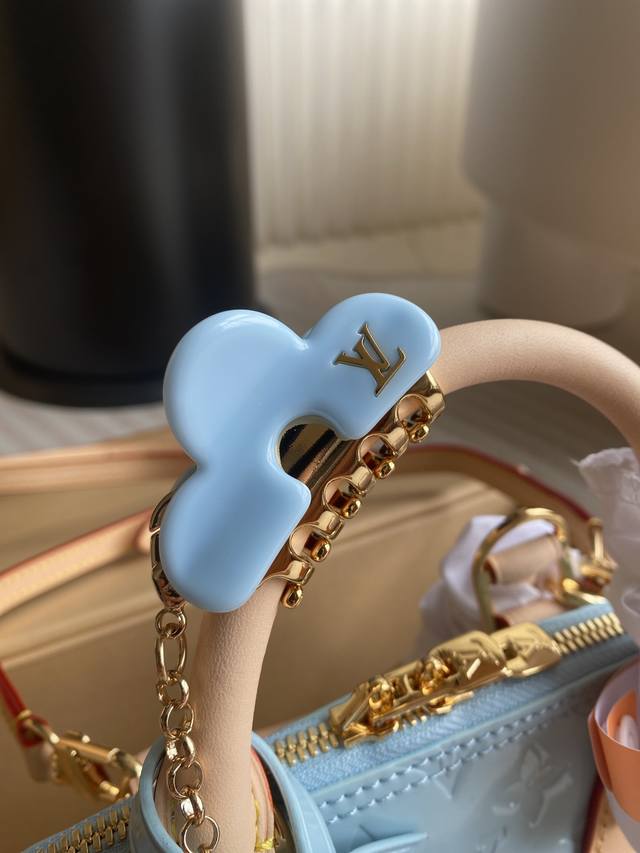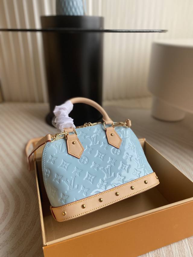 本款 Alma Bb 手袋 M24062 以亮泽 Monogram Vernis 皮革塑就装饰艺术风格的别致构型 搭配牛皮革手柄和下缘 金属铆钉点缀手柄固定位和底部饰边 明丽发夹再添潮流一笔。尺寸:23.5X17.5X11.5Cm