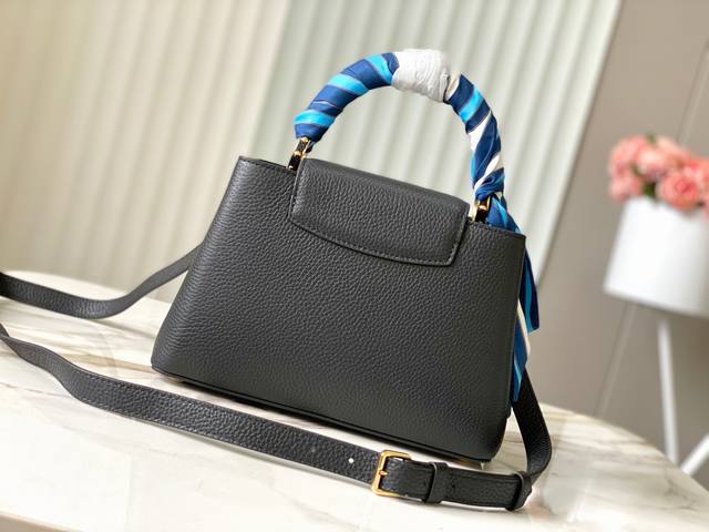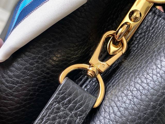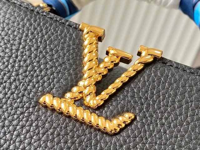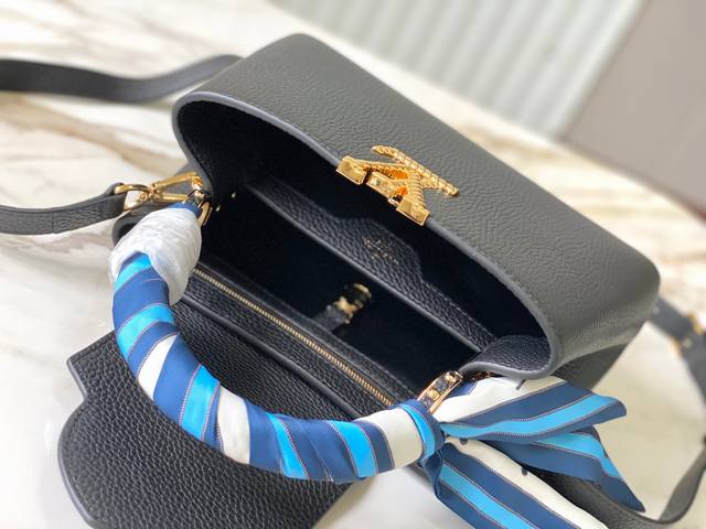 新品特级原单m24673 M48865黑航海风丝巾款 本款capucinesbb手袋出自nautical系列 为taurillon 牛皮革融合多重航海元素:正面耀目lv字母采撷船链设计 包裹顶部手柄的围巾致意深邃海洋 可拆卸并调节的肩带方便肩背和斜挎 Size: 27 * 18 * 9 Cm