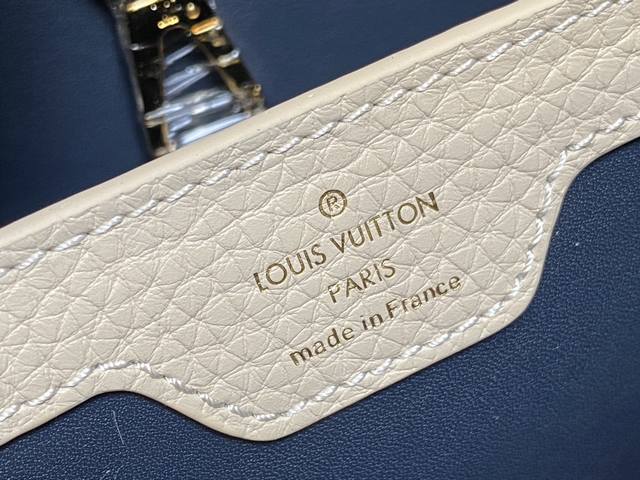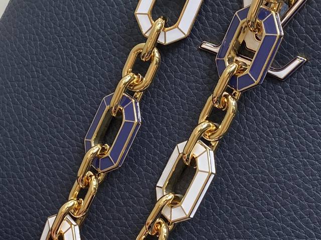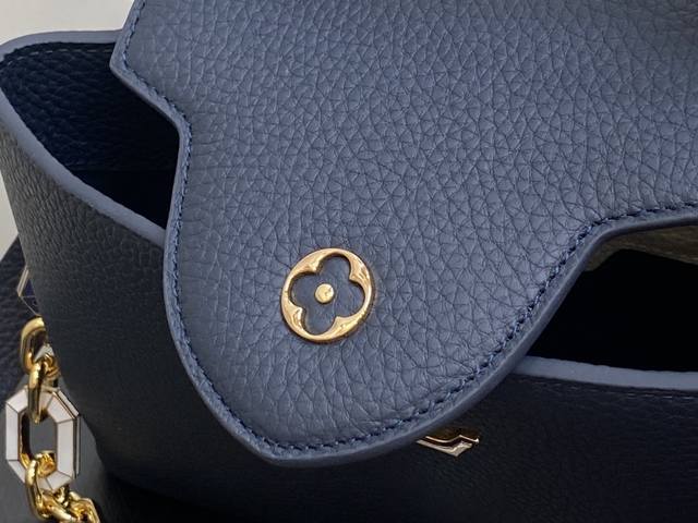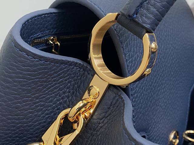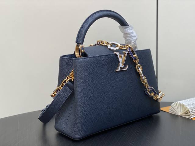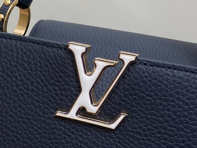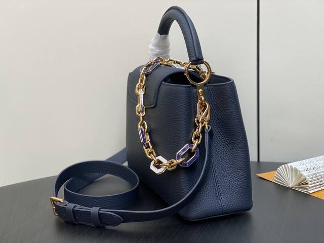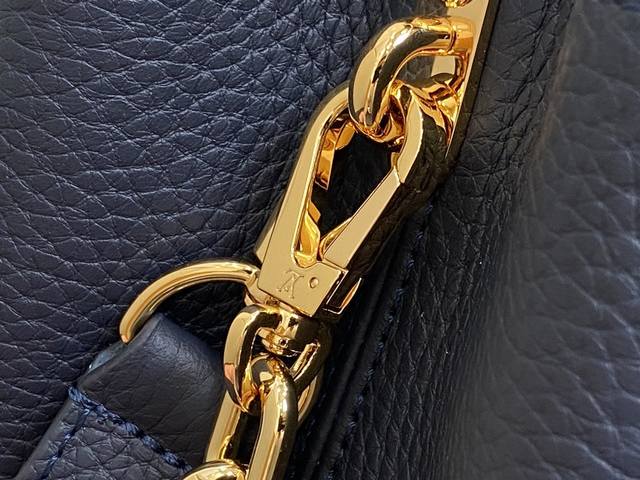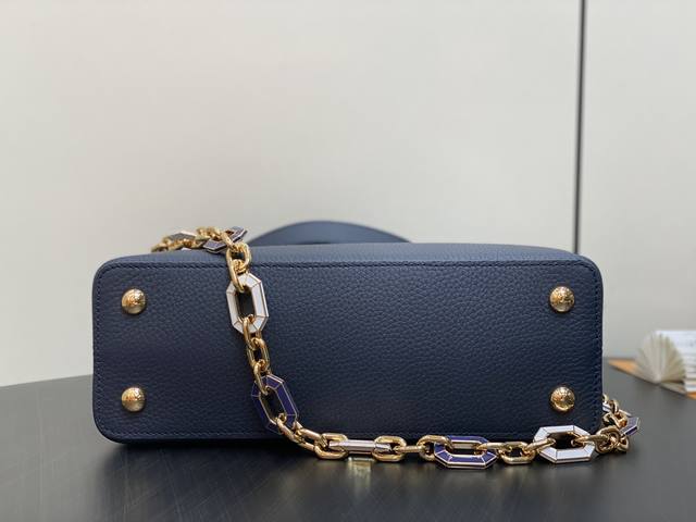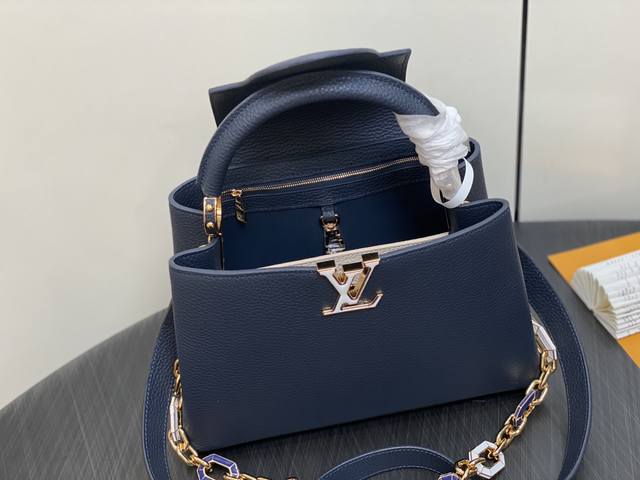 出厂价 顶级原单 M25211深蓝色 链条 M24863 全皮cap那英款系列 Capucines中号手袋 手提包采用浓郁的taurillon皮革制成,配有一条令人愉悦的艺术搪瓷链条。发光链由八角形链接制成,让人回味于装饰艺术设计,并装饰有彩色珐琅,手工精心镶嵌。袋子的签名lv首字母以3D渲染。尺寸:31.5 X 20 X 11 厘米。
