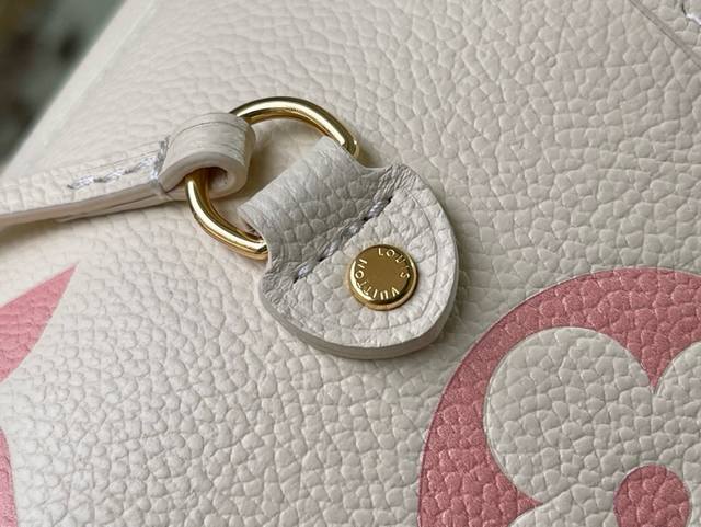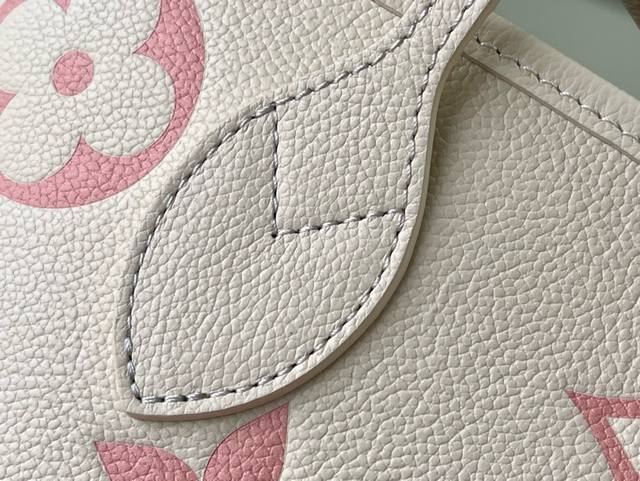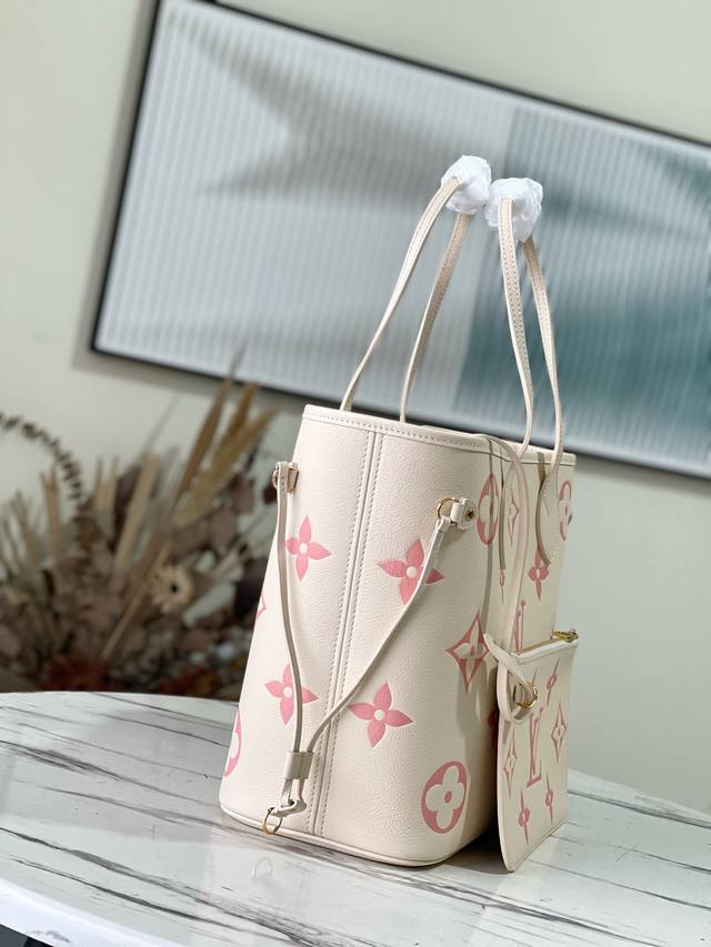 / 头层皮 顶级原单 M45686 21579 奶油白拼粉色丝印 Neverfull中号购物袋 重新设计的内袋采用了清新的织物内衬和灵感源自路易威登档案馆的复古细节