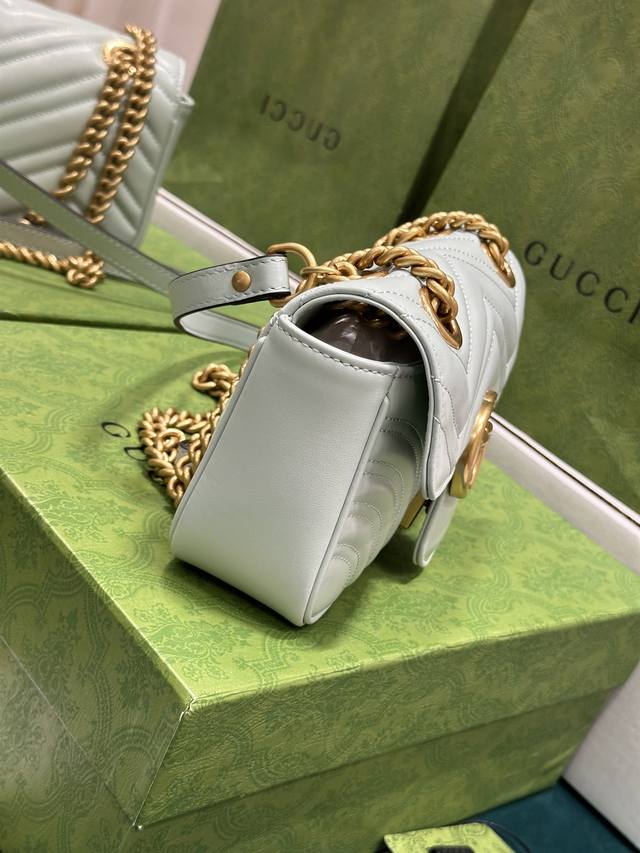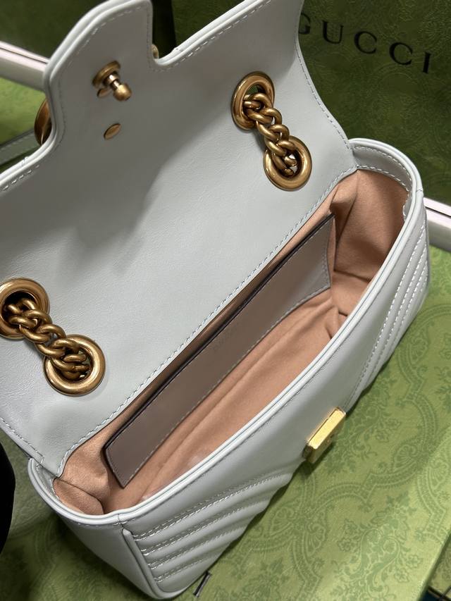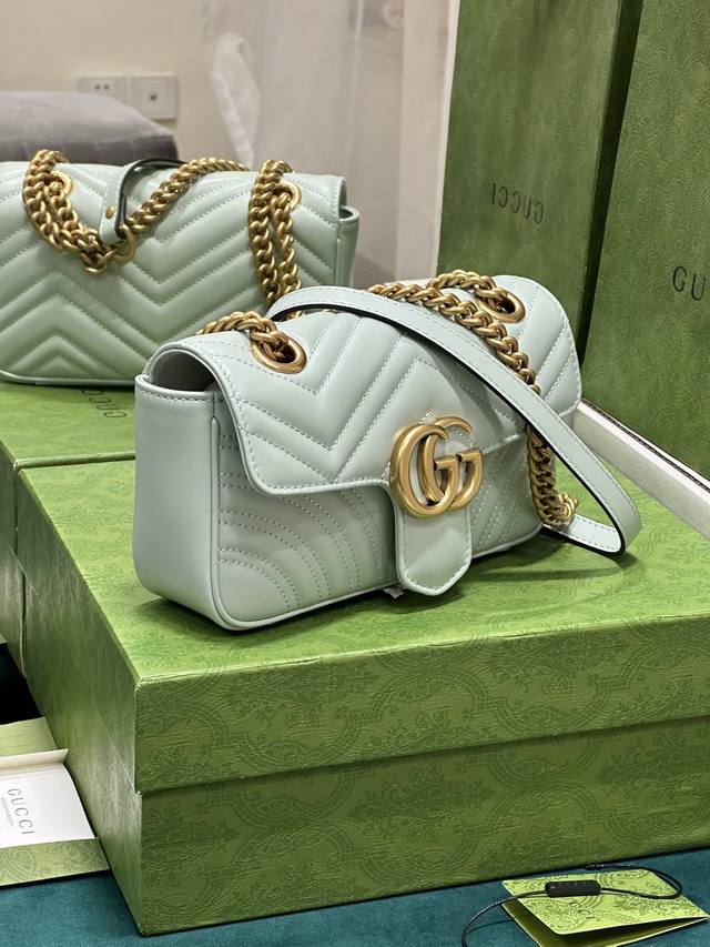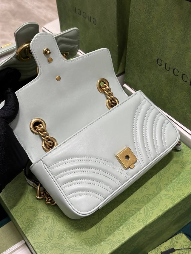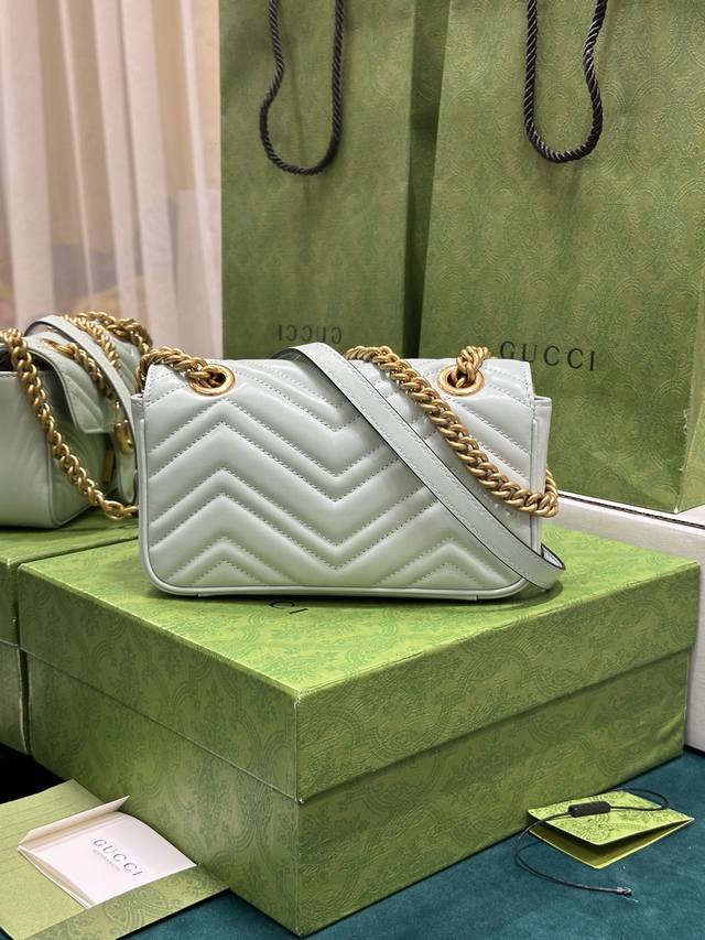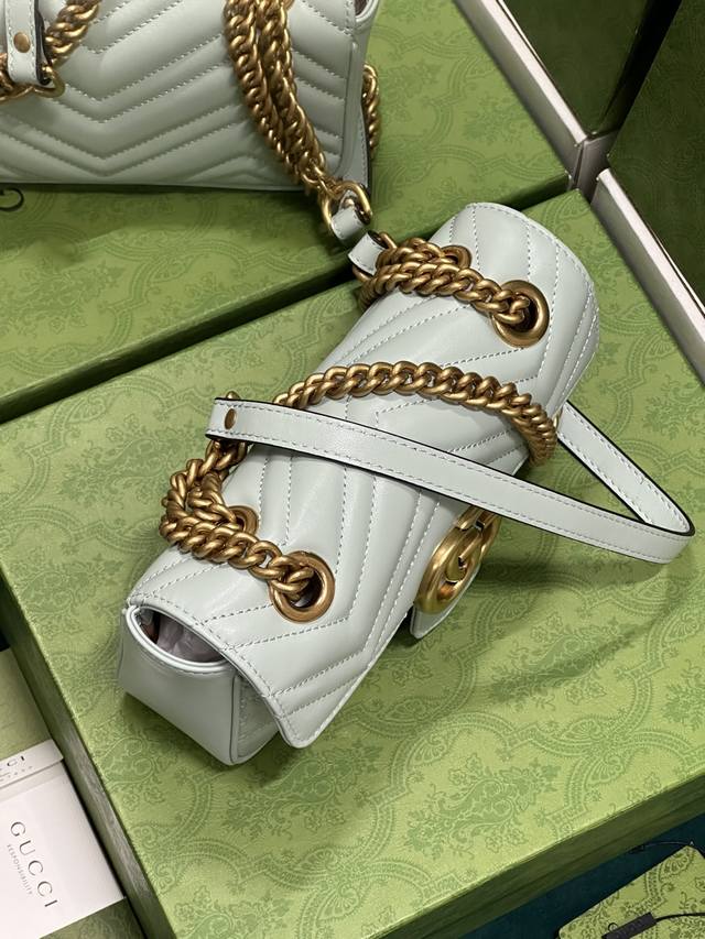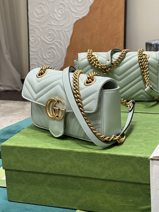 这款gg Marmont系列迷你手袋采用高辨识度造型、柔和的淡绿色绗缝v型皮革材质,包身略显挺括,翻盖开合设计,配有双g配件。这款手袋采用了多样化背法设计,轻松滑动金属链即可在肩背包与手提包之间自如切换。