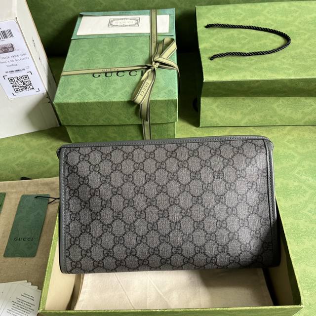 配全套原厂绿盒包装 Ophidia系列手拿包,这款化妆包将标志性双g细节与灰黑配色gg Supreme帆布相结合,通过历久弥新的搭配手法致敬gucci品牌本源。这款配饰呼应,Ophidia系列单品不息的复古情怀。灰色和黑色,Gg Supreme帆布,灰色皮革滚边,钯金色调配件