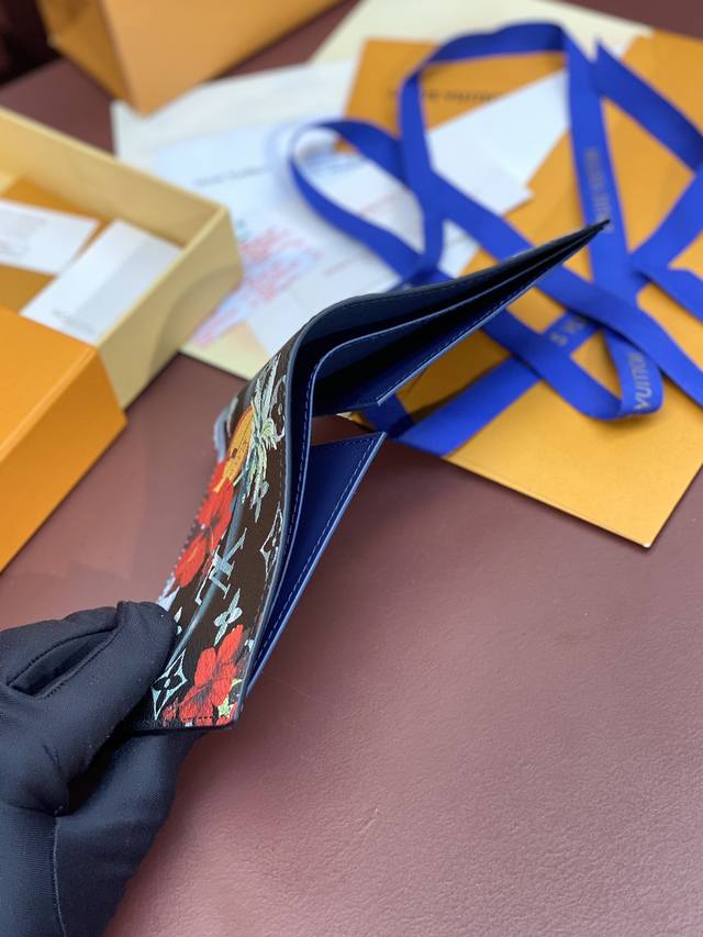 出厂价 M61695 滑板 宝蓝色!本款slender钱夹取材 Monogram Surfin’ 涂层帆布,以热带元素和品牌经典标识交叠缤纷图案,为标志性单品注入复古气息。内部有八个卡槽和一个用于存放钞票的隔层。Size:11X8.5X2Cm。