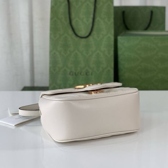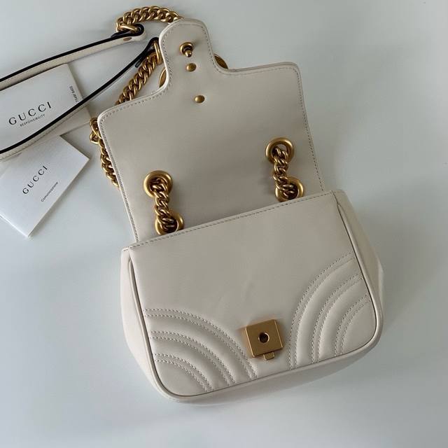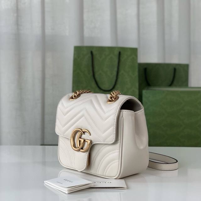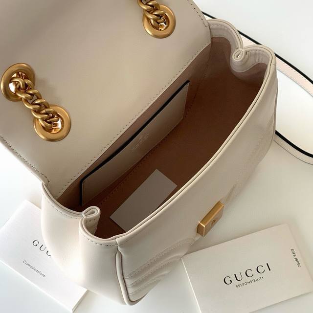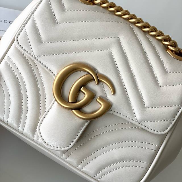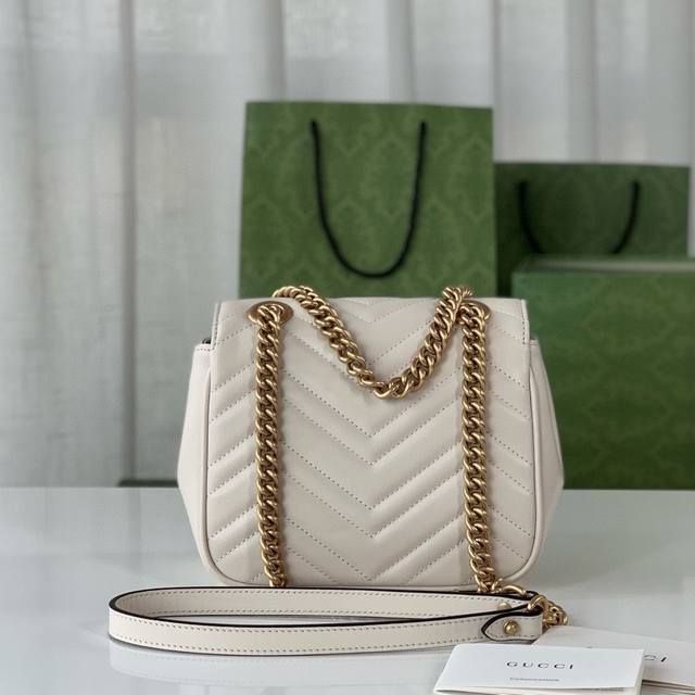 全新gg Marmont系列绗缝迷你肩背包,白色绗缝v型皮革搭配古金色双g,链带拼接皮肩带,款号739682白皮,尺寸18X15X8~