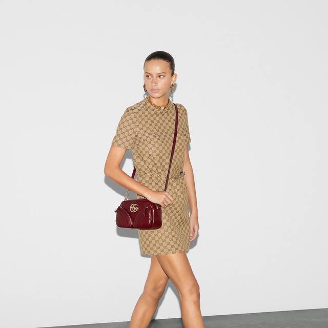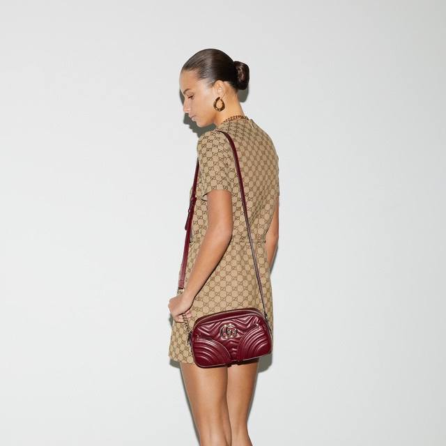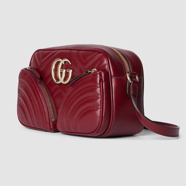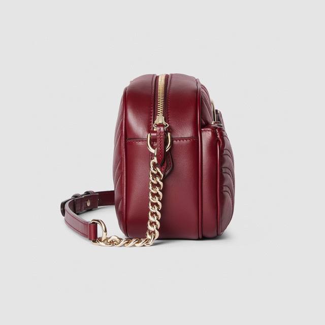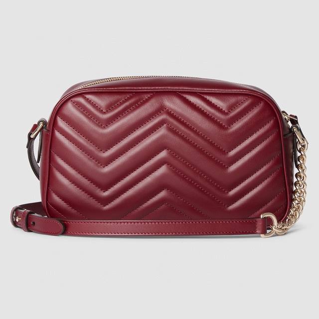 配全套包装 Marmont系列持续融合创新材质与匠心设计,于绗缝v型皮革上诠释几何美学与精致质感,选用两个外层拉链口袋设计,为早秋系列再添力作。黑色色皮革衬里、浅金色调配件和可调节皮革与链式肩带令这款rosso Ancora肩背倍添魅力。