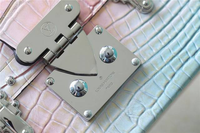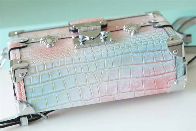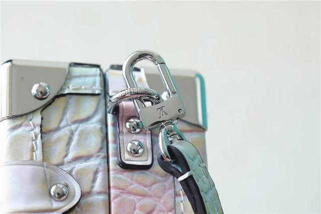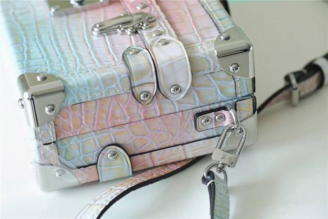 本款 Petit Malle 手袋出自 Nicolas Ghesquière 之手,Monoglam 帆布包身由棉与装饰线织就的覆膜提花底布制成。柔和色彩与瞩目反光效果塑造魅力珠光质感。M44199M82082 M82091 M81976全皮压花鳄鱼纹幻彩丝印盒子包小木盒子oo[握手][握手]可拆卸并调节的皮革肩带实现舒适手提与肩背。