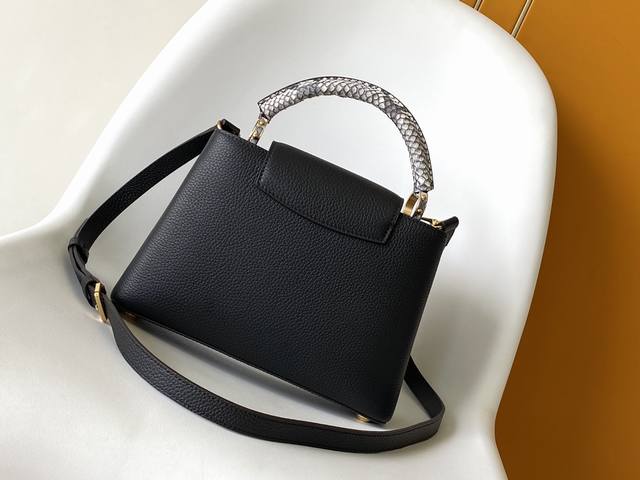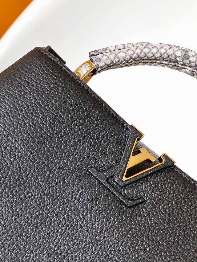 N94755金扣配蛇皮 Capucines手袋经典、优雅,以全粒面 Taurillon 皮革制成,结合了精致优雅的细节设计,包括硬度适中的手柄、连接手柄的华丽扣环,以及宽敞而实用的造型和两个内隔层。那英蛇皮手腕,那英蛇皮手腕全皮女包棕色oo[握手][握手]其别具特色的垂盖有两种使用方式:置于包外可显出 Monogram 花朵图案,置于包内则可露出