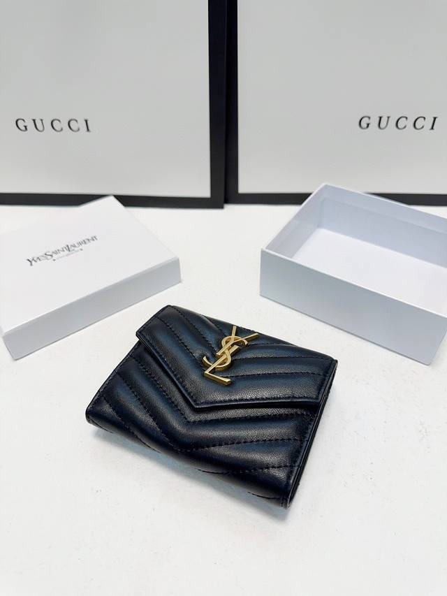 颜色 黑尺寸 11X10圣罗兰款三折短款钱包进口小牛皮质感一流独一无二风格,实用内阁超美超时尚美女必备单品