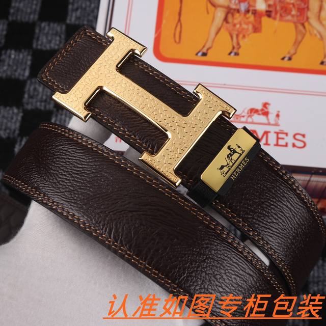 爱马仕皮带进口头层荔枝纹牛皮,搭配原单新款18K钢扣扣头,双面可用,一面黑色 一面咖啡...