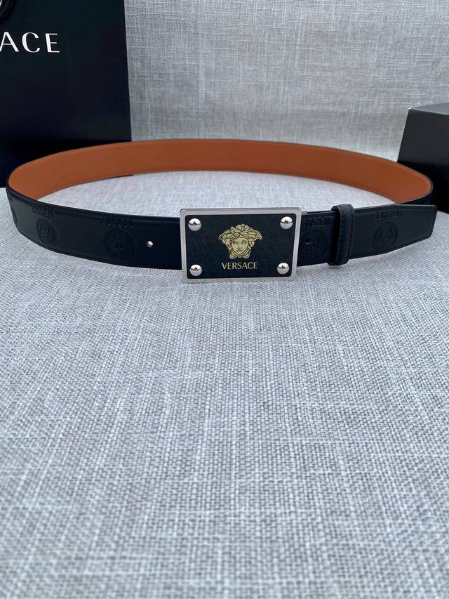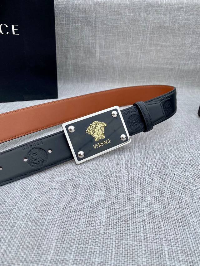 宽度3.5Cm Versace范思哲 此款平纹小牛皮腰带饰有一枚几何形状的希腊回纹搭扣,可搭配正装或休闲装。