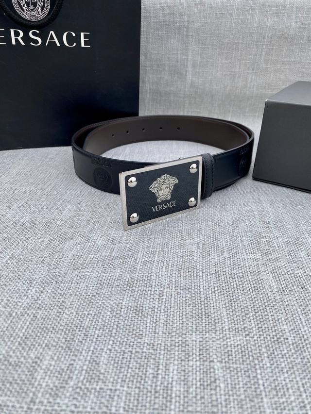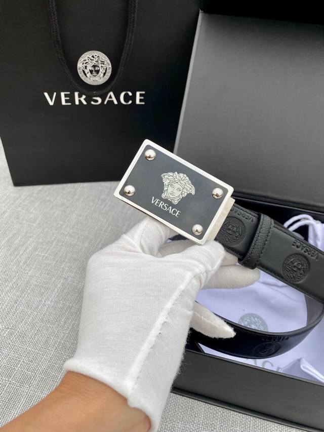 宽度3.5Cm Versace范思哲 此款平纹小牛皮腰带饰有一枚几何形状的希腊回纹搭扣,可搭配正装或休闲装。