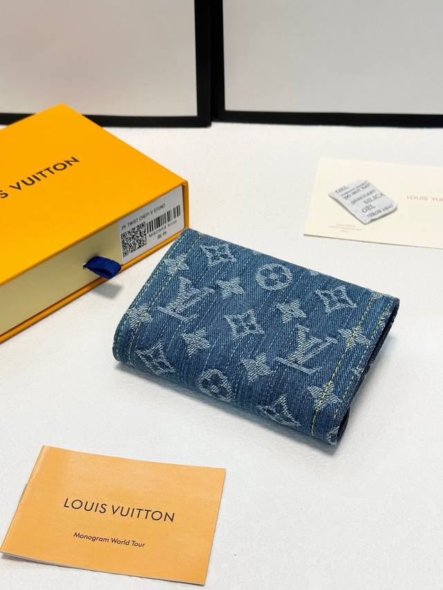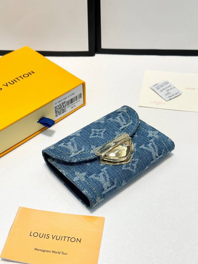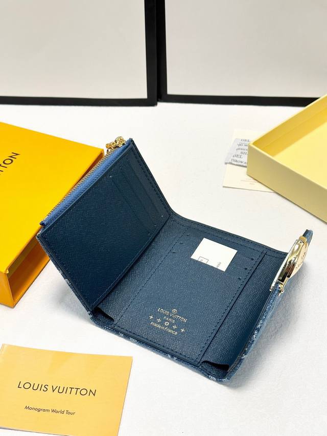 / 颜色 蓝尺寸 12X9.5X1.5Portefeuille Victorine”采用石洗字母组合牛仔帆布制成,营造出休闲氛围。翻盖带有世家标志性的金色插锁,与缝