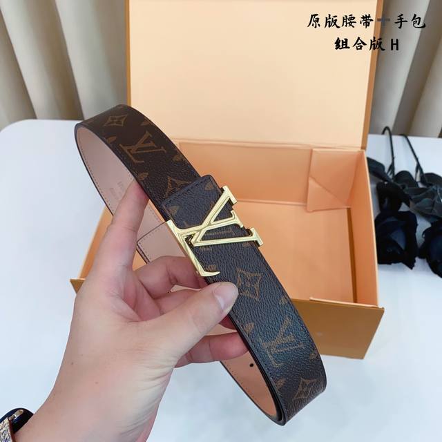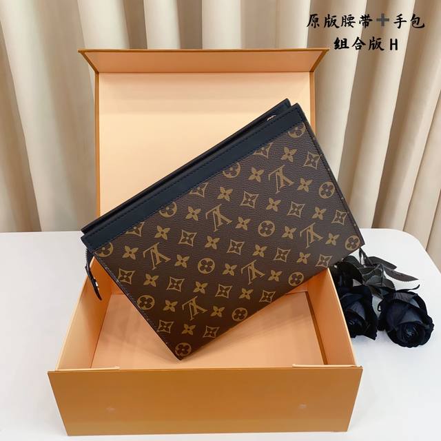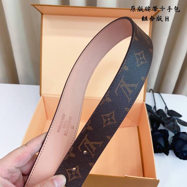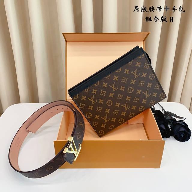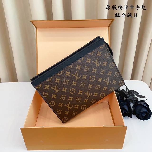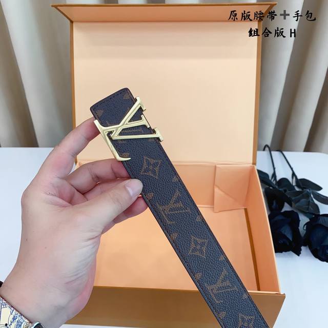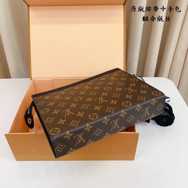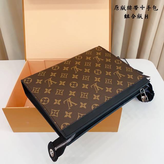 / 腰带手包2件套路易l家 腰带采用原版皮牛皮带身,带宽3.8Cm。扣头采用原版五金扣头。原版手包原版复刻。尺寸:26*20独家定制2件套高端包装。高端大气送礼之佳