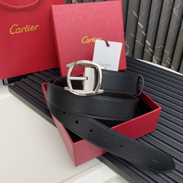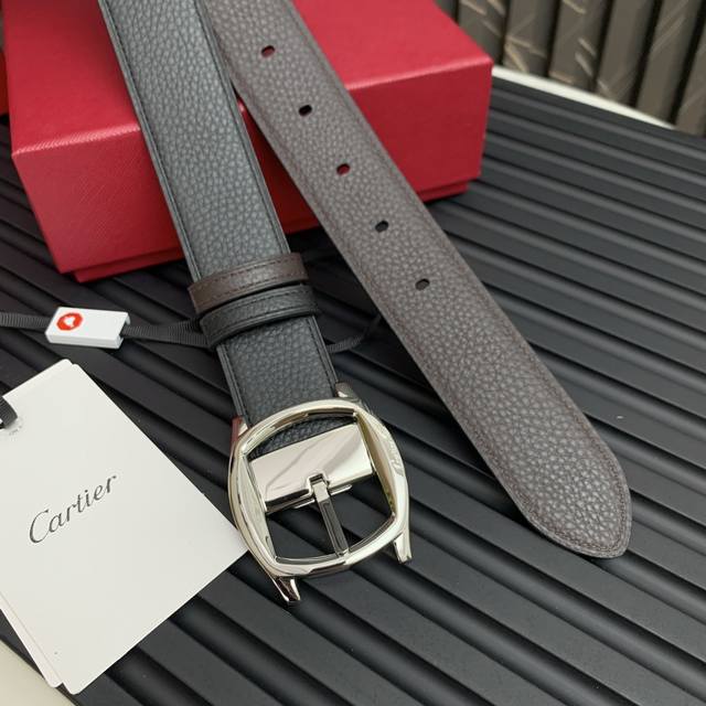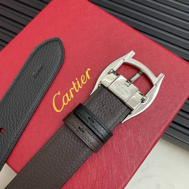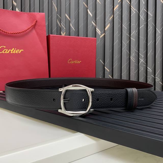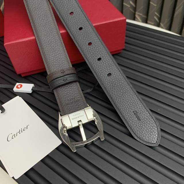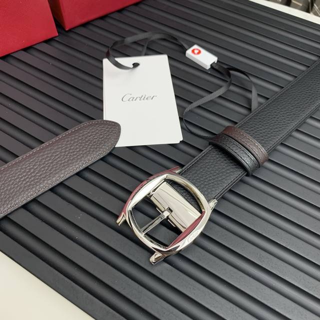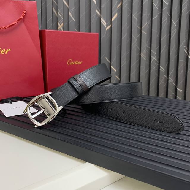 镀钯饰面针扣式皮带,Cartier标志。黑色与棕色牛皮双面皮带,浮雕“Cartier”标志。尺寸:宽35毫米 可调节