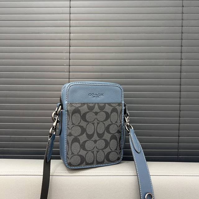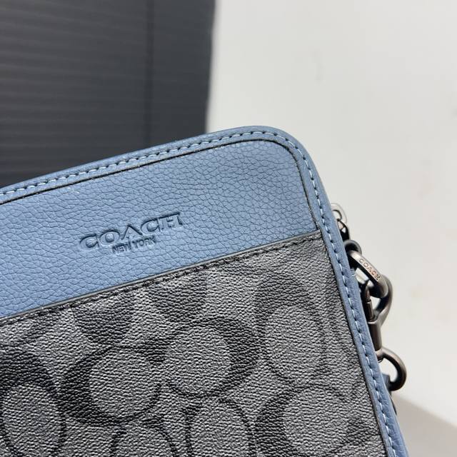 高端货 新款 “Coach蔻驰”相机包 Coach蔻驰 Graham 24 经典老花满印拉链开合相机包 Pvc 单肩斜挎包 中号 男款 黑灰色。高清五金logo