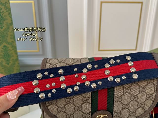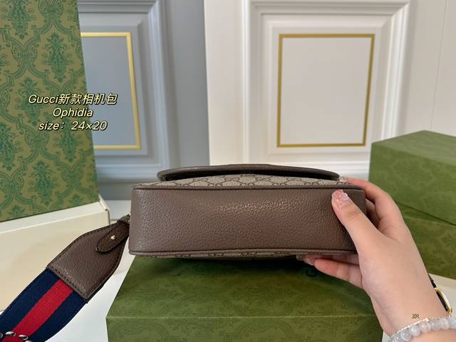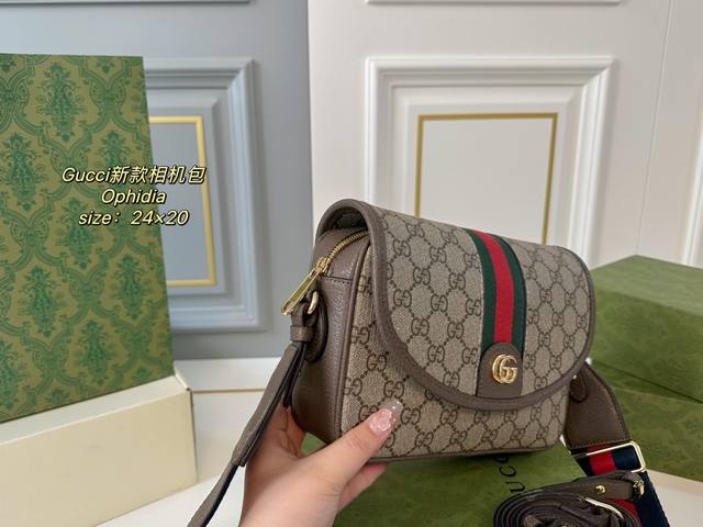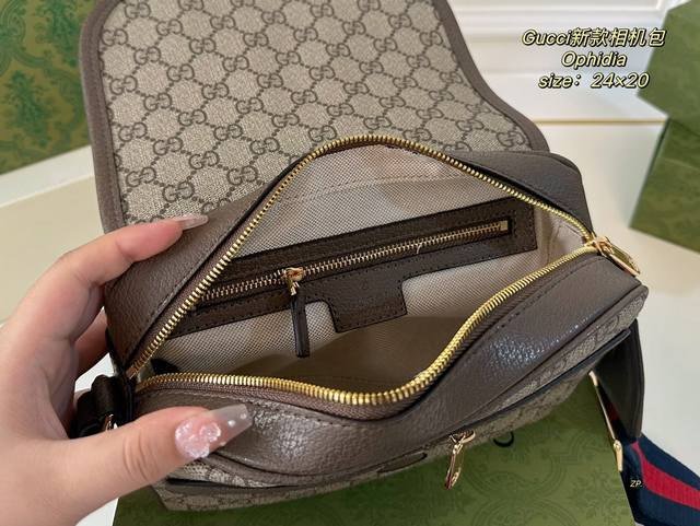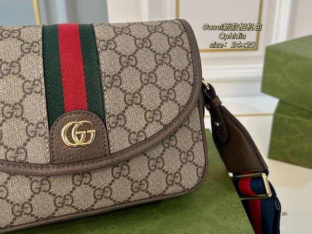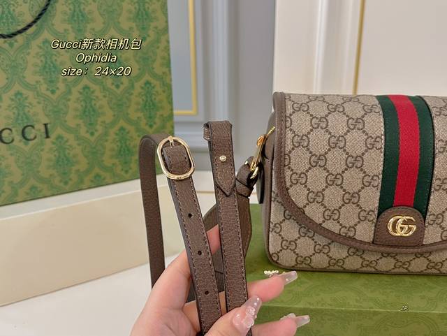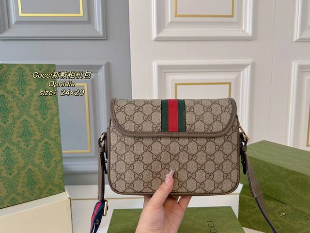/ 飞机盒折叠盒 Size:24×20 Gucci古驰新款ophidia相机包 配有植物和皮质两条肩带 交替使用,风格随心变 简约干净的清爽方正包型, 古驰标志性红