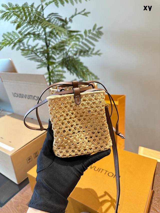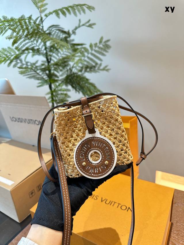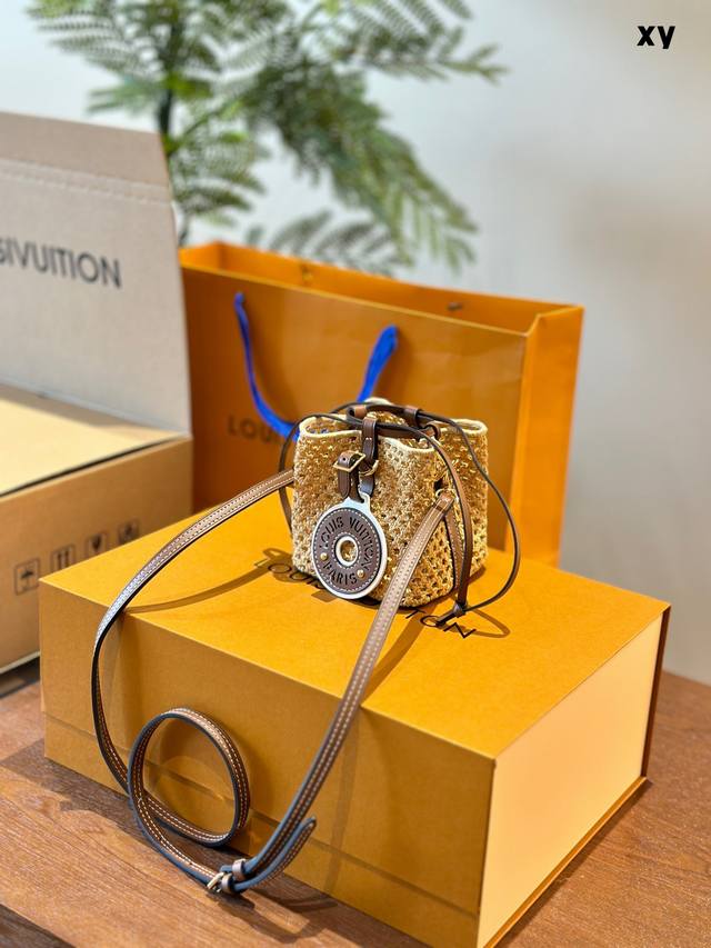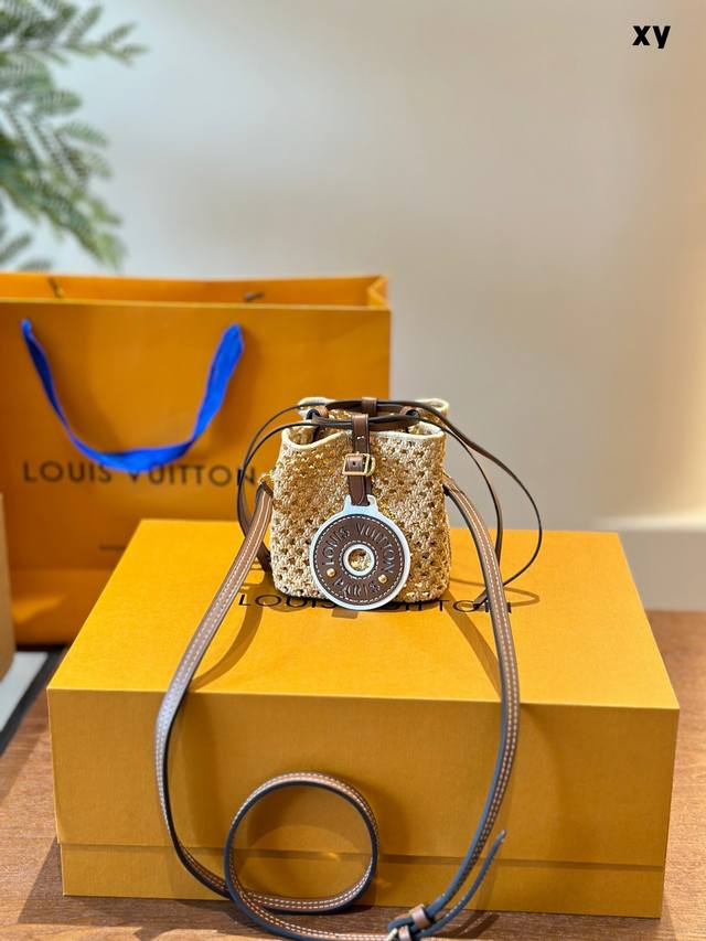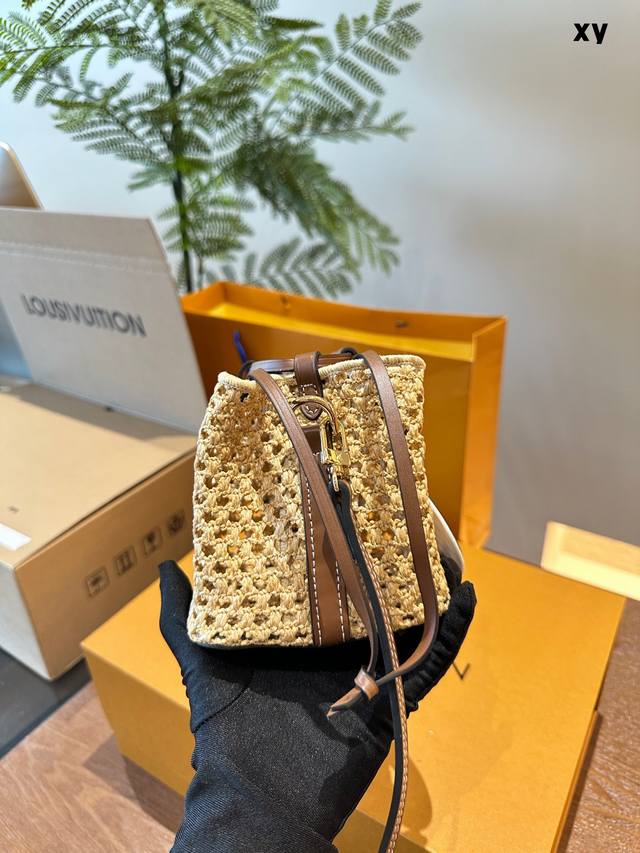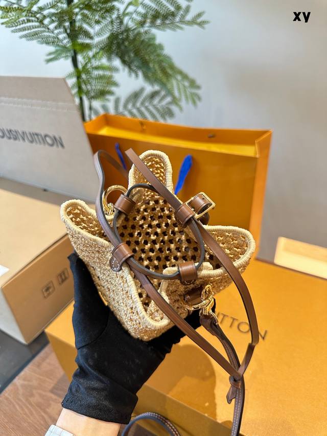 / Lvnoepurse手袋本款noepurse手袋为钩编拉菲草搭配皮革饰边,以源自noe手袋的抽绳设计收束精巧构型。肩带和路易威登 贴饰均可拆卸,实现多种背携方式