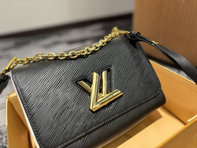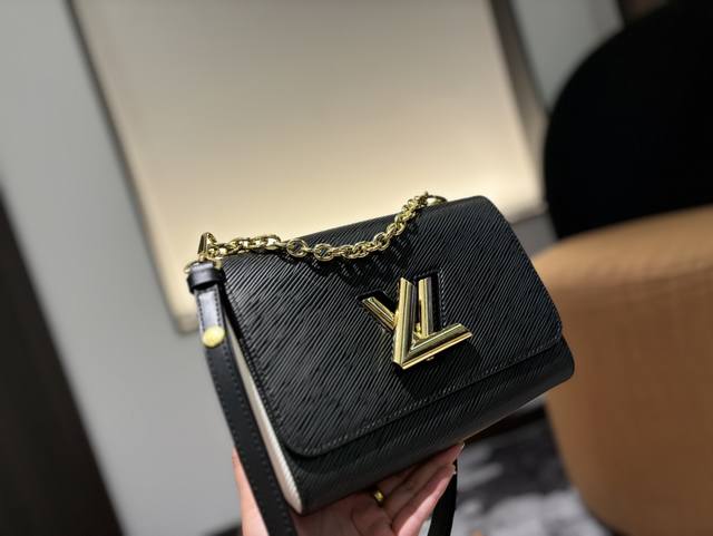 折叠盒尺寸22.16 Lv Twist链条包 呈现新古典twist 中号手袋。水波纹造就聚焦设计:翻盖的超值 明快活泼,自由滑动,无论肩背 斜挎或日夜场合,随心