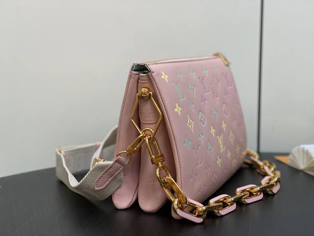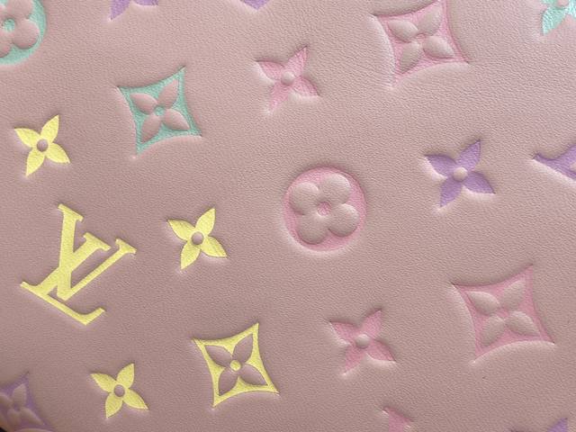 原单精品 M11726粉色丝印 全皮链条包系列 Coussin 小号手袋 本款 Coussin 小号手袋取材 Monogram Empreinte 皮革,以水彩效果 Monogram 印花传递欢欣气息。可拆卸链条融入有机玻璃链环,与可拆卸肩带一道提供肩背或斜挎选择。26 X 20 X 12 厘米。
