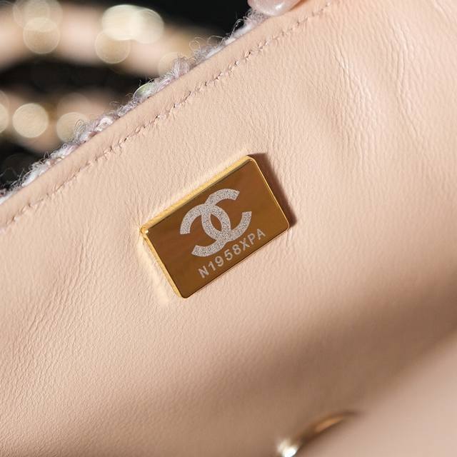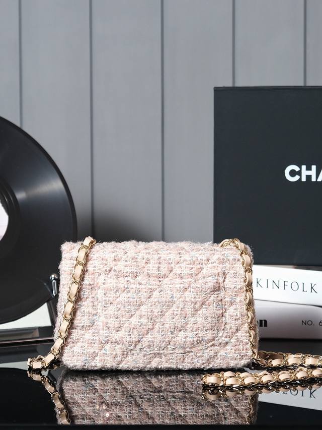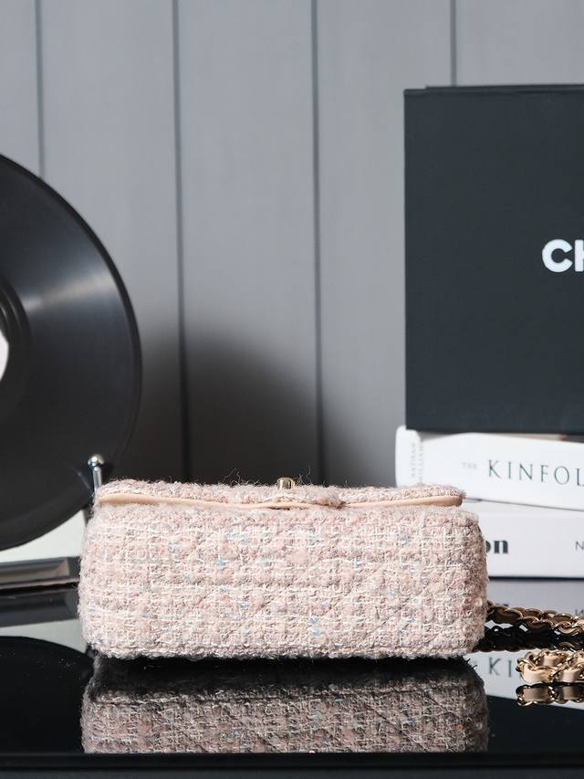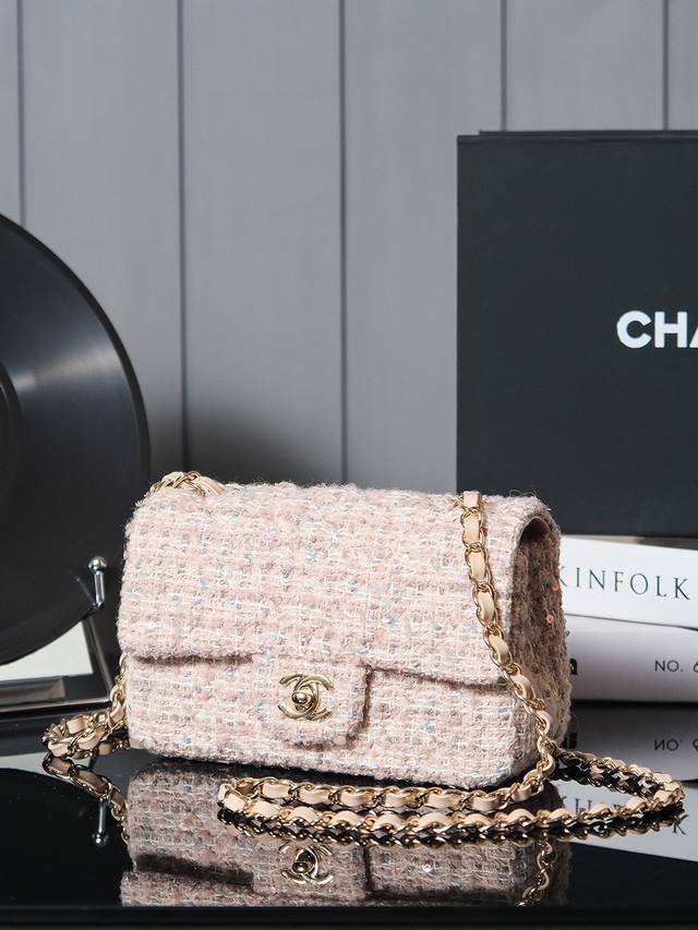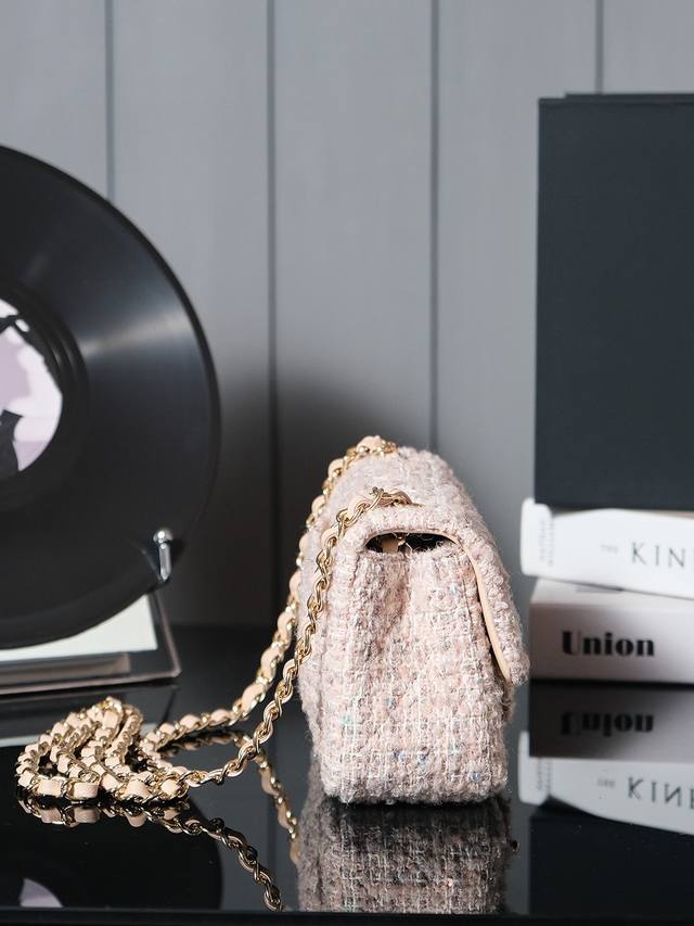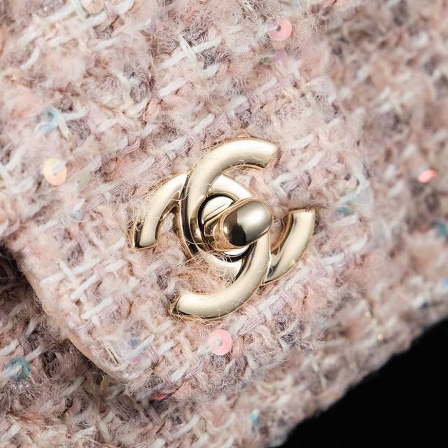 24B新款毛呢亮片cf 少女心爆棚啊 温柔的色调和质感捕获心弦啦 粉嫩的色泽如春日里最柔和的樱花轻轻拂过女孩子的梦境 包身点缀着金色小双c 仿佛童话中的仙境 令人陶醉 粉金编织链条的设计让包包更显神仙般的美 毛呢材质加上精致的格纹 展现不经意的优雅与甜美 一见倾心美包包说的就是她了叭