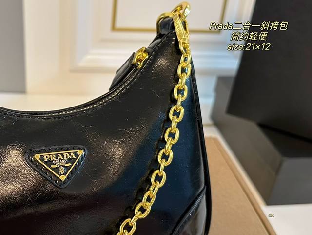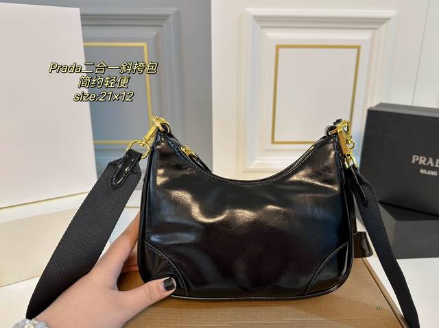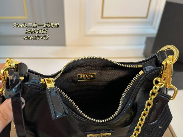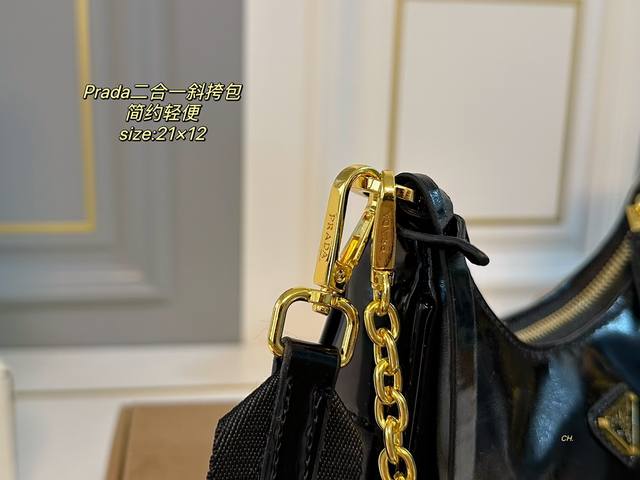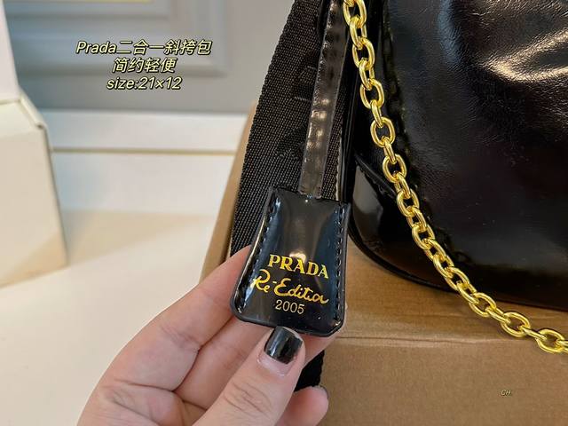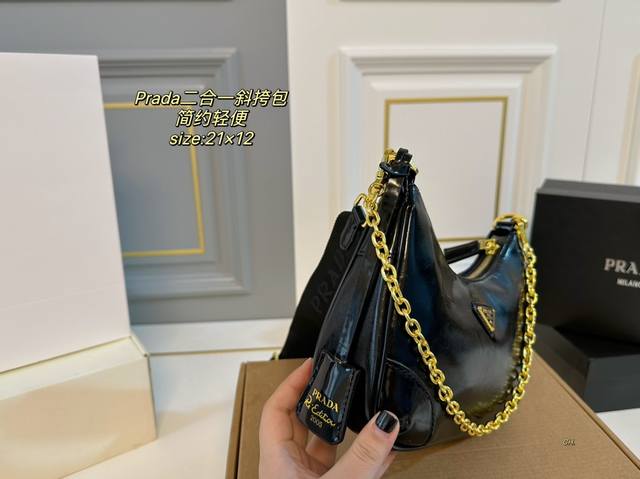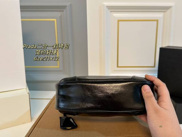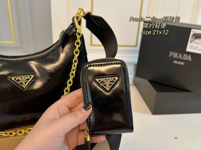 配盒 Size:21×12 Prada普拉达二合一斜挎包 组合式设计,拉链开,很精致~ 可斜挎也做腋下包,配零钱包! 肩带拆卸,造型百变百搭,轻便出行
