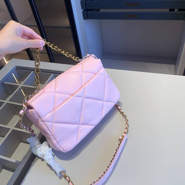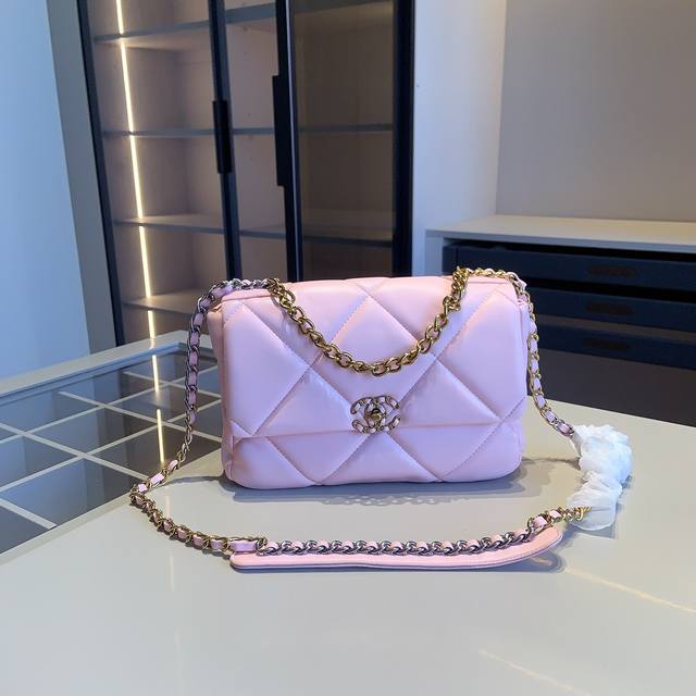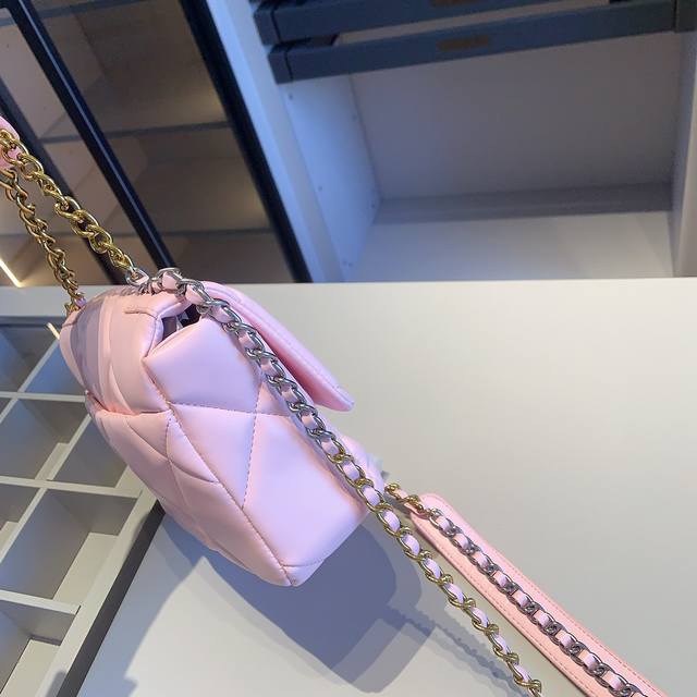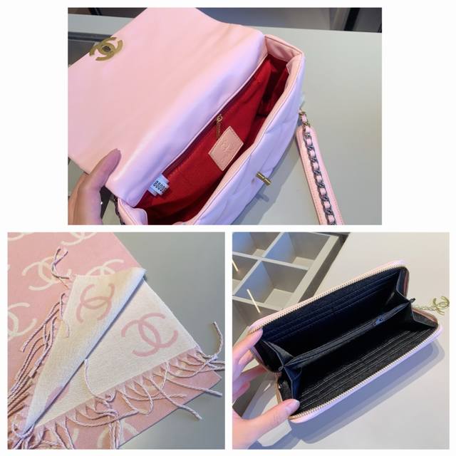产品介绍 最新粉色组合chanel香奈儿专柜同款19Bag最红的爆款哦!原版刺绣面料!手感超棒!原版五金!搭配小香新款羊绒围巾超级时尚百搭小香菱格系列钱包搭配感十足!