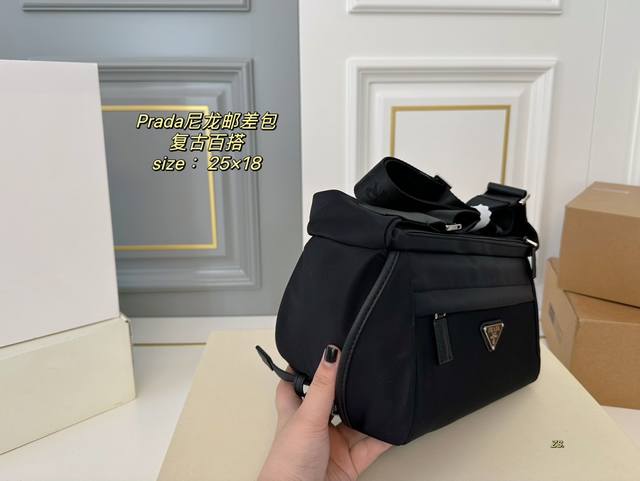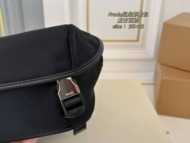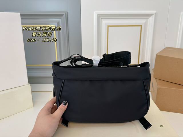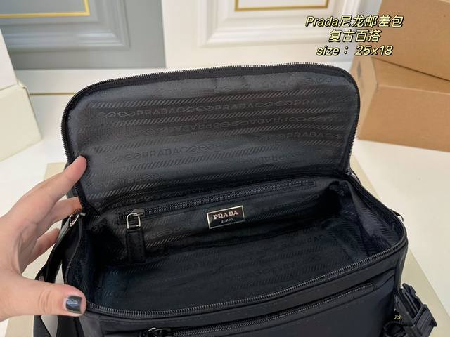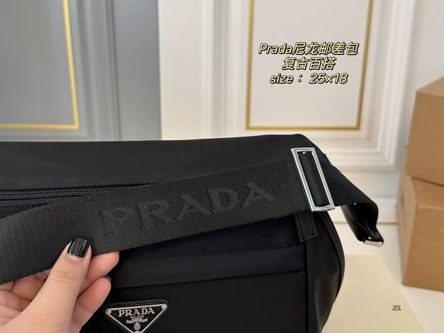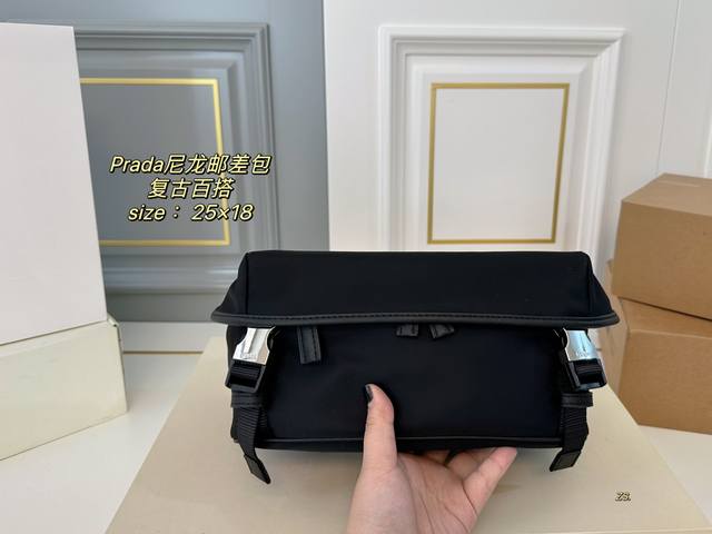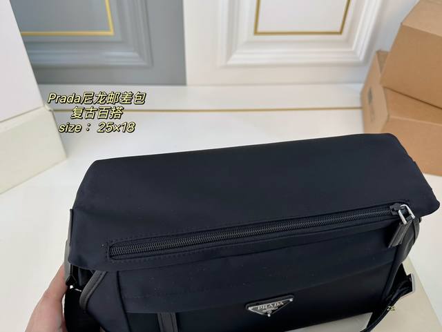 无盒 Size:25×18 Prada普拉达新款尼龙邮差斜挎包 尼龙材质,轻便防水! 黑银配色,高级感十足! 内里容量大,时尚不失轻便~ 男女通用,自带酷酷的感