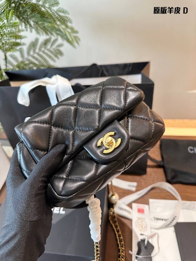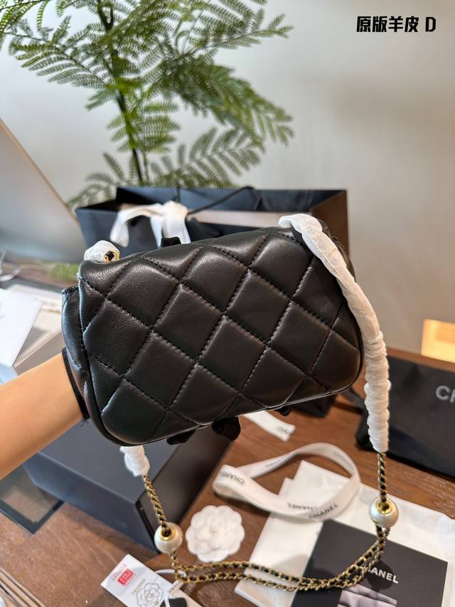 细腻又膨润的羊皮,延续之前的经典外形,换珍珠啦,链条是双珍珠可调节的设计更新颖独特,珍珠球上还镶嵌了一个小双c简约大气又很精致~