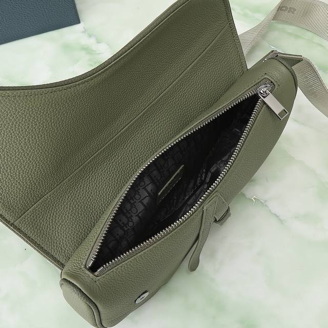 这款马鞍包时尚经典。采用卡其色粒面牛皮革制作,饰以对比鲜明的缉面线提升格调,磁性翻盖隐藏着拉链隔层,可妥善收纳各种日常用品。搭配可调节的 Christian Dior 标志提花肩带,可斜挎。